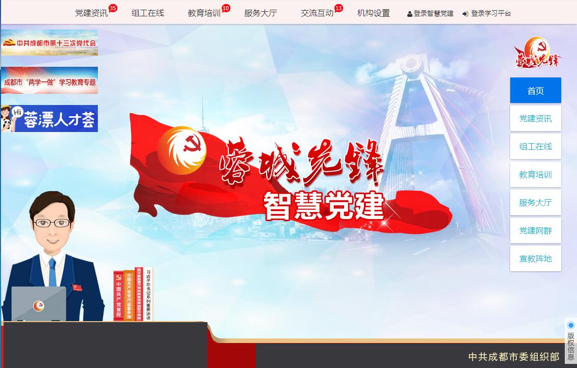 蓉城先鋒智慧黨建網(wǎng)由中共成都市委組織部主辦。其主要職責(zé):一、研究、指導(dǎo)全市各級黨組織特別是黨的基層組織的建設(shè);研究各類新經(jīng)濟組織中黨組織的設(shè)置和活動方式;協(xié)調(diào)、規(guī)劃和指導(dǎo)全市黨員教育工作,主管黨員的管理和發(fā)展工作;負責(zé)全市黨組織和黨員的統(tǒng)計,黨費的收繳和管理使用工作;組織新時期黨的建設(shè)理論研究。二、提出區(qū)(市)縣和市級各部門及市委、市政府管理的直屬事業(yè)單位以及其他列入市委管理機構(gòu)的領(lǐng)導(dǎo)班子的調(diào)整、配備和領(lǐng)導(dǎo)干部任免的意見和建議;負責(zé)中央、省委管理干部的職務(wù)任免、工資、待遇和離退休上報材料和手續(xù)辦理,以及有關(guān)上報中組部、省委組織部的備案材料;配合中央和省有關(guān)部門考察中央、省在蓉單位的領(lǐng)導(dǎo)班子和領(lǐng)導(dǎo)干部,并對其領(lǐng)導(dǎo)班子和領(lǐng)導(dǎo)干部的調(diào)整、任免提出意見和建議;承辦市委管理干部的職務(wù)任免、工資、待遇和離退休審批手續(xù);承辦市委管理干部和市級黨委、人大、政協(xié)機關(guān),群團、政法系統(tǒng)干部的調(diào)配、交流、安置工作;負責(zé)市黨代會、人代會、政協(xié)會的有關(guān)組織工作和區(qū)(市)縣黨代會、人代會、政協(xié)會的指導(dǎo)工作。三、指導(dǎo)縣以上領(lǐng)導(dǎo)班子的思想作風(fēng)建設(shè);根據(jù)中央、省委關(guān)于干部隊伍的方針政策,研究制訂全市干部隊伍建設(shè)、領(lǐng)導(dǎo)班子建設(shè)的政策措施,組織落實培養(yǎng)和選拔中青年干部,加強后備干部隊伍建設(shè)的工作。四、研究、指導(dǎo)黨的組織制度和干部人事制度改革,制訂或參與制訂組織、干部、人事工作的重要政策和制度;負責(zé)全市干部統(tǒng)計和市管干部檔案管理,指導(dǎo)、檢查全市干部檔案管理工作。五、負責(zé)組織工作和干部工作的監(jiān)督、檢查及有關(guān)的綜合協(xié)調(diào)工作,及時向市委和中央組織部、省委組織部匯報、反映情況,提出建議。負責(zé)市和區(qū)(市)縣機關(guān)有關(guān)干部的備案審查工作;綜合協(xié)調(diào)、監(jiān)督檢查干部宏觀管理工作。六、主管干部教育工作。制訂全市干部教育規(guī)劃和有關(guān)政策規(guī)定;負責(zé)中央黨校、省委黨校、市委黨校及其他有關(guān)培訓(xùn)班的學(xué)員調(diào)訓(xùn);負責(zé)組織一定層次的中青年干部以及組織部門負責(zé)人進行培訓(xùn);負責(zé)領(lǐng)導(dǎo)干部和后備干部赴國(境)外和選送到國內(nèi)高等院校培訓(xùn)、進修;指導(dǎo)、協(xié)調(diào)干部教育的師資隊伍建設(shè)和教材編寫工作;研究、探索有中國特色的干部教育培訓(xùn)制度。七、負責(zé)全市人才工作的牽頭抓總、宏觀指導(dǎo)、組織協(xié)調(diào)和督促檢查;負責(zé)黨政“一把手”抓第一生產(chǎn)力目標責(zé)任制的組織實施、成都市有突出貢獻的優(yōu)秀專家的推薦選拔、科技副職的選拔、博士服務(wù)團工作等;指導(dǎo)全市人才信息化建設(shè)。八、歸口管理市委老干部局。負責(zé)離退休干部工作的宏觀管理,研究制訂或參與制訂離退休干部工作的政策。九、完成市委和中央組織部、省委組織部交辦的其他任務(wù)。