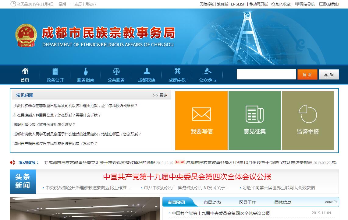 成都市民族宗教事務局主要職責: (一)貫徹執(zhí)行國家、省、市有關民族宗教工作的方針政策和法律、法規(guī)、規(guī)章;起草有關地方性法規(guī)和規(guī)章草案。(二)負責協(xié)調推動有關部門履行民族工作的相關職責,對民族工作進行業(yè)務指導,促進民族政策在經濟發(fā)展和社會事業(yè)等有關領域的實施、銜接。(三)組織開展全市民族宗教理論、政策和重大問題的調查與研究,向市委、市政府提出有關民族宗教工作的政策建議;負責處理涉及違反民族宗教政策、法律、法規(guī)等方面的問題;負責處理民族宗教方面的突發(fā)事件;會同相關部門共同處理民族關系中的重大事項,參與協(xié)調民族地區(qū)社會穩(wěn)定工作。(四)指導并協(xié)助少數(shù)民族團體貫徹落實黨的民族政策,搞好日常管理和開展自養(yǎng)事業(yè);負責全市民族成份的審查和更改;會同有關部門指導和協(xié)調民族經濟、扶貧開發(fā)、民族特需用品生產、民族地區(qū)經濟協(xié)作、對口支援等工作;參與擬訂全市少數(shù)民族經濟社會相關領域的發(fā)展規(guī)劃,促進建立和完善少數(shù)民族事業(yè)發(fā)展綜合評價監(jiān)測體系,推進實施民族事務服務體系和民族事務管理信息化建設。(五)依法履行宗教事務管理職責,保護公民宗教信仰自由和正常的宗教活動,維護宗教界合法權益,促進宗教關系和諧。(六)指導區(qū)(市)縣宗教事務部門依法履行管理職責、處理宗教事務的重大事件,防范利用宗教進行非法、違法活動,抵御境外利用宗教進行的滲透活動。(七)推動民族宗教界開展愛國主義、社會主義、維護祖國統(tǒng)一和民族團結的自我教育,鞏固和發(fā)展同民族宗教界的愛國統(tǒng)一戰(zhàn)線,團結和動員廣大民族宗教界人士為改革開放和經濟建設服務。(八)指導、幫助宗教團體培養(yǎng)、教育宗教教職人員,依法加強管理,幫助宗教團體搞好自身建設和辦好自養(yǎng)事業(yè);辦理宗教團體需由政府協(xié)助解決或協(xié)調的事務;引導宗教與社會主義社會相適應。(九)廣泛聯(lián)系少數(shù)民族和宗教界代表人士,協(xié)助有關部門做好少數(shù)民族干部的培養(yǎng)、教育和使用;負責市級宗教團體工作人員的人事管理工作,指導落實宗教教職人員生活待遇工作。(十)會同有關部門處理民族宗教方面的涉外事宜,指導幫助民族宗教界開展對外友好交往活動。(十一)承辦市政府公布的有關行政審批事項。(十二)承辦市委、市政府交辦的其他事項。