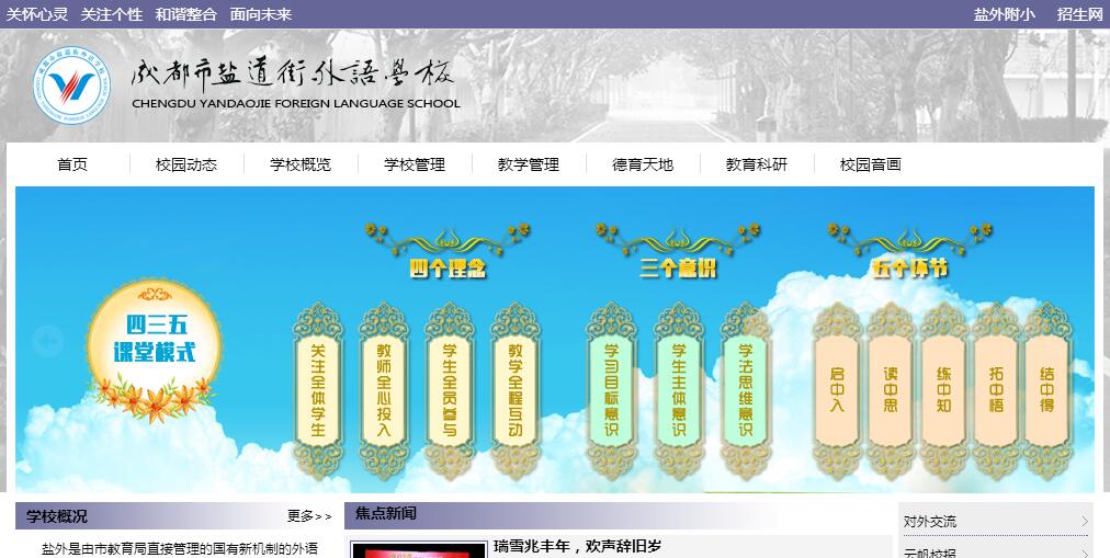 成都市鹽道街外語學校創(chuàng)建于2002年,是由成都市教育局直接管理的新機制的外語實驗學校,設(shè)有小學部、中學部,實行小學、初中到高中的十二年一貫寄宿制。學校位于成都市機場路土橋段76號,占地100余畝,地處城南成熟社區(qū),交通十分便利,學習環(huán)境美麗幽靜,離塵不離城。校園內(nèi)芳草茵茵,綠樹成林,建筑布局合理,亭臺樓宇交相輝映。教學設(shè)備設(shè)施均按一類學校配備,是莘莘學子讀書求學的理想之地。成都市鹽道街中學外語學校是由市教育局直接任命校長的學校之一,其全國有的性質(zhì)決定了她有更高的可靠性與教育質(zhì)量保障,擁有更雄厚教育資源的支持。新機制使其具有更多的辦學自主權(quán)和靈活有效的用人機制。學校干部隊伍年富力強,具有成熟的教學管理經(jīng)驗、又不失開拓創(chuàng)新精神,其中兩名校級干部在鹽道街中學任現(xiàn)職。教師隊伍以省市重點中學教師為主體,并聘有多名外籍教師,新的用人機制吸引一大批骨干教師到校應(yīng)聘,既有教壇新秀,更有資深教師。其中特級教師、學科帶頭人、高級教師職稱的人數(shù)已占教師隊伍的50%,可謂群星燦爛、人才濟濟。學校堅持以課程改革為核心,全面推進素質(zhì)教育,以培養(yǎng)學生德識雙馨、堅毅練達和諧發(fā)展為辦學目標,堅持以人為本、關(guān)注個體、和諧整合、整體提高的辦學理念,讓學生全面發(fā)展、特長發(fā)展。以尊師守紀、勤學好問、自尊自強、全面發(fā)展為學風,以愛生重德、嚴謹治教、刻苦鉆研、勇于創(chuàng)造為教風,始終堅持以質(zhì)量求生存,以特色求發(fā)展。實行小班額(每班不超過38人)特色化教學,給每個學生提供針對性更強的個性化優(yōu)質(zhì)教育。學校嚴格執(zhí)行國家課程計劃,突出外語教學特色,積極推進選修課程和活動課程。學校以住宿制為主的管理方式,有利于學生學會生活,學會做人,形成自主獨立的品質(zhì)與關(guān)愛和諧的團隊精神。學校與國內(nèi)外多所知名學校建立了廣泛、深入和穩(wěn)定可靠的合作關(guān)系。與國際知名、國內(nèi)一流的北京景山學校結(jié)為友好合作學校同步實施教學計劃;與法國蒙特貝魯左拉中學、美國崔尼特學校和新加坡法國學校建立了共識鏈,共享國際化、現(xiàn)代化教育資源。學校按照高起點、快發(fā)展、做精品的思路辦學,從起步開始,這種新機制帶來的良好教育效益便受到社會的關(guān)注。我校校風好、學風正、管理嚴、質(zhì)量高為社會普遍認同。建校十五年來,鹽外人負重拼搏,走內(nèi)涵發(fā)展的道路,不斷加強隊伍建設(shè),改善辦學條件,優(yōu)化教育教學管理,提升辦學效益,努力彰顯學校特色,做了大量扎實有效的工作。不僅培育出了李偉、袁藝等北大、清華學子,為985和211工程的大學及國際名校輸送了一批優(yōu)秀人才,更以師生的有效、全面、和諧的成長,獲得了良好的社會認同,取得了一些在省內(nèi)外有一定影響力的階段性辦學成果。近年,學校先后榮獲了:“全國民辦教育先進集體”、“全國校園足球特色學?!薄ⅰ八拇ㄊ£柟怏w育示范學?!?、“成都市民辦教育先進集體”、“成都市新成長型學?!?、“成都市先進基層黨組織”、“成都市教育系統(tǒng)先進基層黨組織”、“創(chuàng)先爭優(yōu),樹立四個新形象”示范黨組織、“黨工共建創(chuàng)先爭優(yōu)示范點”、“四川省教科文衛(wèi)體系統(tǒng)模范職工之家”、“全市教育系統(tǒng)創(chuàng)先爭優(yōu)先進基層黨組織”、“成都市心理實驗學?!?、“成都園林式單位”、“成都市特色高中項目學?!薄ⅰ鞍踩逃龑嶒瀰^(qū)全國示范學?!保俺啥际形拿餍@”等一系列榮譽。主研的“十一五”規(guī)劃龍頭課題“小班化課堂教學的反饋與調(diào)控研究”獲得中國教育學會課題成果一等獎;累計榮獲國家級榮譽或表彰獎勵17項;獲得省級榮譽或表彰獎勵14項;市、區(qū)(縣)級以上集體榮譽或表彰獎勵64項。謝丹琦等33位教師榮獲特級校長、學科帶頭人、先進黨務(wù)工作者、先進德育工作者、成都市優(yōu)秀教師、成都市優(yōu)秀青年教師等各級榮譽稱號。目前,學校依托興教公司雄厚的教育資源與資金支持,綜合教育質(zhì)量和辦學效益一年一個臺階,必將再創(chuàng)輝煌。