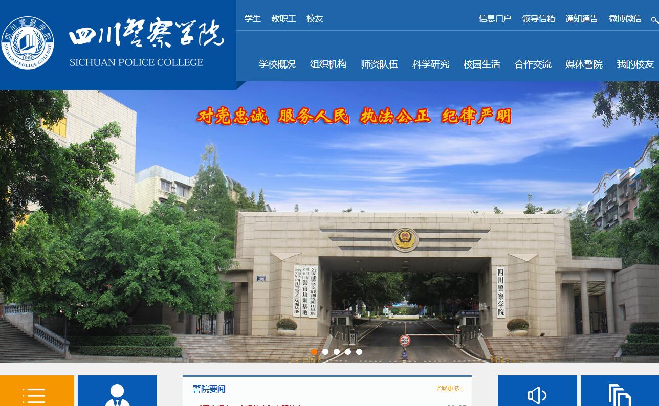 四川警察學院是由四川省政府主辦,四川省公安廳和四川省教育廳按職責分工共同管理的全省唯一一所全日制政法公安類普通本科院校,是四川警力補充的主渠道和民警培訓的主陣地。學校始于1950年建立的川西人民行政公署公安廳公安學校,2000年建立四川警官高等??茖W校,2006年升本建立四川警察學院,2011年獲批警務專業(yè)碩士研究生培養(yǎng)試點項目,2018年獲批碩士學位授予單位,是全國31所省屬公安院校中第六所升本、第一所開展警務專業(yè)碩士研究生教育、第一所擁有碩士學位授予權的學校。公安部先后在學校建立公安部警務實戰(zhàn)訓練四川基地、援藏辦學點、國際維和警察選拔培訓點,省公安廳在學校建立四川省公安廳警官培訓基地、四川省公安民警心理訓練基地、四川省公安廳戰(zhàn)訓基地。學校以“鑄造忠誠警魂、培育時代新警、服務公安工作”為辦學宗旨,秉承“政治建警、依法治校、從嚴治學、特色發(fā)展”辦學理念,堅持公安學歷教育、在職民警培訓和警務科學研究協(xié)同發(fā)展,走職業(yè)化應用型內(nèi)涵式發(fā)展道路,立足四川、面向政法,培養(yǎng)適應現(xiàn)代警務發(fā)展需要,具有忠誠政治品格、嚴明法紀意識、良好人文素養(yǎng)、扎實專業(yè)知識、過硬警務技能和富有創(chuàng)新精神的公安專業(yè)人才,努力建成具有鮮明區(qū)域特色的國內(nèi)高水平公安本科高校。學校先后為各級公安機關和政法部門培養(yǎng)輸送6萬余名畢業(yè)生,涌現(xiàn)出8700余名英雄、模范、功臣,110余名校友為共和國獻出生命,被譽為“警察的搖籃、英雄的熔爐、精神的鑄所”。學校位于四川省瀘州市,占地面積467.15畝,固定資產(chǎn)總值44993.94萬元,其中教學儀器設備15029.98萬元、圖書92.01萬冊;現(xiàn)有本科生5046人、碩士研究生15人;教職工457人,其中專兼職教師355人(正高職稱44人,副高職稱91人,碩博士219人),實行公務員和人民警察身份管理;開設有偵查學、治安學、公安管理學、禁毒學、刑事科學技術、交通管理工程、網(wǎng)絡安全與執(zhí)法、消防指揮、法學9個本科專業(yè);建有國家級實驗教學示范中心1個,國家精品課程3門,國家級教學團隊1個;省級人才培養(yǎng)模式創(chuàng)新實驗區(qū)1個,省級實驗教學示范中心1個,省級虛擬仿真實驗教學中心1個,四川省高校重點實驗室1個,省級精品課程10門,省級特色專業(yè)2個,省級應用型示范專業(yè)3個,省級教學團隊3個,省社科聯(lián)及省教育廳人文社科研究基地5個。黨的十八大以來,學校深入研判公安高等教育發(fā)展面臨的時代背景和學?;拘G?,深刻總結(jié)和反思學校在辦學定位、人才培養(yǎng)和特色培育等方面存在的突出問題和原因,迅速作出“回歸公安本位、貼近公安實戰(zhàn)、服務公安工作”的轉(zhuǎn)型決定,明確“職業(yè)化應用型”發(fā)展方向,確立“歸位發(fā)展、內(nèi)涵發(fā)展、特色發(fā)展”總體思路,按照“控規(guī)模、調(diào)結(jié)構、突特色、重實戰(zhàn)、提質(zhì)量、促發(fā)展”實施路徑,積極搶抓發(fā)展機遇,持續(xù)深化綜合改革,取得明顯成效,各項事業(yè)發(fā)展步入良性軌道。中國特色社會主義進入新時代,學校黨委深入學習領會黨的十九大精神和習近平新時代中國特色社會主義思想,按照“符合現(xiàn)代高等院校特征、體現(xiàn)現(xiàn)代警察院校特點、突出四川警察學院特色”要求,提出今后一段時期指導學校各項事業(yè)發(fā)展的“一二三四五”發(fā)展戰(zhàn)略??傮w思路是:瞄準一個目標,圍繞兩大中心,堅持三線并進,打造四個平臺,實施五大工程。“一個目標”即:到2022年,基本形成結(jié)構合理、重點突出、特色鮮明、競爭力強的一流公安類學科專業(yè)體系,全面建立以職業(yè)化、專業(yè)化、實戰(zhàn)化為導向的人才培養(yǎng)機制,人才供給質(zhì)量和科研服務能力穩(wěn)步提升,內(nèi)部治理體系更加完善,治理能力明顯增強,功能布局更趨合理,運行機制更具活力,基本建成具有鮮明區(qū)域特色的國內(nèi)高水平公安本科院校;“兩大中心”即:圍繞服務支撐國家藏區(qū)穩(wěn)定戰(zhàn)略和西部邊疆安全戰(zhàn)略,服務支撐國家中心城市首位提升和國家“一帶一路”倡議兩大中心任務;“三線并進”即:堅持預備警官培養(yǎng)、在職民警培訓、警事科學研究三條主線并重并進,全面推進學校內(nèi)涵建設和特色發(fā)展;“四個平臺”即:按照“校警聯(lián)動,教戰(zhàn)一體,建制管理,常態(tài)值守”要求,著力打造覆蓋四川和輻射周邊藏區(qū)的預備警官培養(yǎng)陣地、藏區(qū)民警綜合訓練基地、服務實戰(zhàn)和支撐決策的四川警事科學研究院、支撐國家中心城市和輻射主要藏區(qū)的應急處突戰(zhàn)備基地四個平臺;“五大工程”即:以大思政育人體系建設、學科專業(yè)建設和警察職業(yè)能力提升、優(yōu)質(zhì)師資團隊培育、公安智庫建設、涉藏警務特色打造等“五大改革系統(tǒng)工程”為牽引,不斷夯實辦學治校基礎,全面提高辦學質(zhì)量和教學科研水平,為全省公安工作和公安隊伍建設提供人才保障和智力支撐,為建設美麗繁榮和諧四川貢獻更大力量。