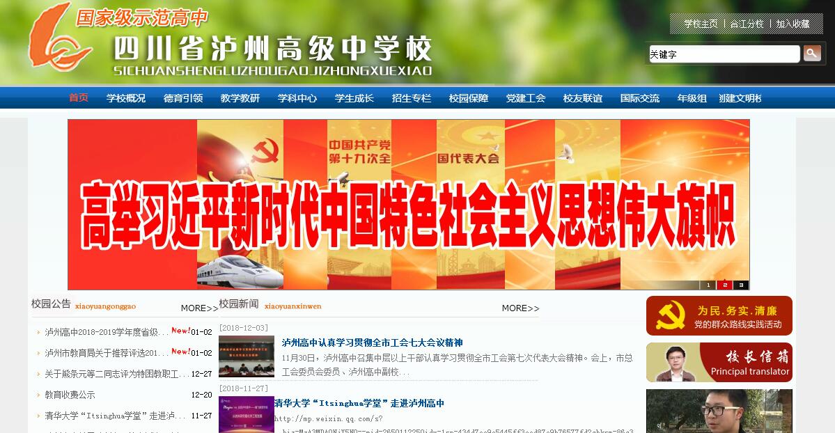 四川省瀘州高級中學校(瀘州六中)創(chuàng)建于1954年,郭沫若題寫校名。學校1981年被評為四川省首批42所重點中學之一,2003年元月,學校順利通過省教廳專家組檢查評估,成為四川省首批國家級示范性普通高中。2014年被為四川省一級示范性普通高中。1966年秋因招收初中改為四川省瀘州市第六中學校。2003年3月省教廳批準恢復為四川省瀘州高級中學校。學校先后被評為全國“五講四美、為人師表”先進集體、全國學校藝術教育先進單位、全國貫徹《學校體育工作條例》優(yōu)秀學校、全國示范家長學校、第一批全國中小學中華優(yōu)秀文化藝術傳承學校、省首批校風示范校、省中小學德育工作先進單位、省體育傳統(tǒng)項目學校、省現(xiàn)代教育技術示范校、省綠化示范校和部門綠化百佳單位、省百所藝術特色學校、省百所心理健康教育實驗學校、省檔案管理一級學校、中國傳統(tǒng)文化楹聯(lián)教育基地、聘請外教專家資格單位,四川省職業(yè)道德建設十佳標兵單位、四川省思想政治工作先進單位、四川省“創(chuàng)建學習型組織,爭做知識型技能型職工”活動先進單位、四川省第四批綠色學校、四川省第二批綠化模范單位。學校占地180畝,校舍建筑面積60090 平方米。校園布局合理,景色宜人。教學區(qū)由教學樓(毓秀樓)、實驗樓(致遠樓)和綜合樓(時雨樓)組成,設施設備齊全。運動區(qū)有多功能體育館、恒溫游泳館、籃球場、足球場和400m塑膠體育場。圖書館藏書豐富,開架借書,書報閱覽室期刊種類繁多,全天對學生開放;高規(guī)格學生公寓寬敞舒適,生活方便,新建學生食堂現(xiàn)代、大氣,能同時容納3000人就餐;理化生實驗室、多媒體電教室、通用技術實驗室、計算機網(wǎng)絡教室等設備一應齊全,校園廣播、閉路電視、教學平臺形成網(wǎng)絡。教學樓頂鐘聲悠揚,催人奮進。校園周邊開墻透綠,燈柱環(huán)繞。學校厚重的歷史、現(xiàn)代化的氣韻、如詩如畫的環(huán)境,成為莘莘學子增長智慧的勝地,成人成才的搖籃。學?,F(xiàn)有137個高中教學班,學生7615人。教職工475人,專任教師447人,其中高級教師138人。學歷達標率為100%,研究生畢業(yè)61人。先后有11位教師被評為特級教師,有17位四川省高中骨干教師,有省、市學術和技術帶頭人及學科帶頭人20人,12人被評為全國“五一”勞動獎章獲得者、全國模范班主任、全國勞模、全國優(yōu)秀教師等,16人獲四川省青年教師優(yōu)質課大賽一等獎,其中2人獲全國優(yōu)質課競賽一等獎,1人獲全國優(yōu)質課競賽二等獎。38人獲市青年教師優(yōu)質課大賽一等獎,有各級學會負責人14人。依靠這支師德高尚、教藝精湛的教師隊伍,學校在教育、教學、科研等各項工作中不斷取得優(yōu)異成績。學校擁有一支高素質的教師隊伍和一流的教育質量,應屆生高考本科升學率達到80%、上重本線比例達50%。應屆生高考本科升學率、上重本線比例及上名牌大學的人數(shù)在市內領先。近年來,學校有34位學生考上北大,36人夢圓清華,32次奪高考全市文理科狀元,131人次獲全國學科競賽等級獎,257人次獲省級獎勵。人文藝術教育是學校的鮮明辦學特色。舞蹈《南國好大雪》、《天邊的紅云》、《陽光女孩》、《逗春》、《送紅軍》分獲四川省一至五屆中學生藝術節(jié)一等獎,其中舞蹈《南國好大雪》1998年代表四川省參加由教育部、文化部、廣播電影電視總局、共青團中央主辦的全國中學生藝匯演(在北京人民大會堂演出)獲優(yōu)秀節(jié)目一等獎、創(chuàng)作獎、指導教師三項大獎。舞蹈《陽光女孩》2007年代表四川省參加全國第二屆中小學生藝術節(jié)匯演(深圳)獲一等獎。舞蹈《逗春》2010年2月將代表四川省參加第三屆中小學生藝術節(jié)匯演(上海),獲一等獎,并參加閉幕式演出。舞蹈《送紅軍》2016年4月青島全國第五屆中小學生藝術節(jié)展演二等獎。2005年,學校藝術團成員隨瀘州市藝術團到英國萊斯特郡訪問演出,2007年,學校藝術團成員隨瀘州市藝術團到澳大利亞悉尼市訪問演出。學生傳統(tǒng)詩詞教育成績卓著。學生傳統(tǒng)詩詞教育成績卓著,學校有詩詞楹聯(lián)社、松濤文學社、瀘州市詩詞學會瀘州高中分會等文學社團組織。學生參加始于1992年的瀘州市“屈原魂”詩詞大賽(每年一屆)獲等級獎人數(shù)78名,占全市43.58%,作品收入《雛鳳集》、《嘉樹集》、《跨世紀中學生詩詞選》,詩教經(jīng)驗在南京、武漢、瀏陽等三次全國詩詞學會上交流,受到中華詩詞學會的表揚。早在上世紀九十年代中期,學校先后接待贊比亞和美國等國客人來訪。自2002起開始聘請外籍教師上英語口語課。2005年與英國皮卡特學校結為姊妹學校,與該校進行互訪活動已10次。 2012年與美國澳諾羅中學結為姊妹學校,互訪6次。 學校的辦學思想是:著眼整體,突出主體,面向全體,給學生人格與智慧的強健雙翅,讓學生在新世紀的藍天高翔。學校的辦學目標是:將瀘州高中辦成高質量、有特色、省內一流、全國知名的現(xiàn)代化示范校。人才培養(yǎng)目標是:培養(yǎng)人格高尚、擁有智慧、能動創(chuàng)造的站在時代前列的社會主義事業(yè)的建設者和接班人。校訓:崇德 博學 求實 健身