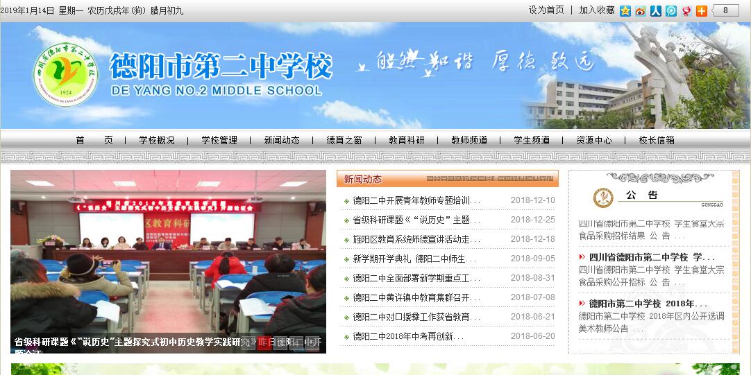 四川省德陽(yáng)市第二中學(xué)校是一所全日制公辦學(xué)校,創(chuàng)建于1924年,是市區(qū)內(nèi)一所近百年的歷史名校。學(xué)校位于交通便利的市區(qū)東門,毗鄰風(fēng)景優(yōu)美的石刻公園?,F(xiàn)目前,學(xué)校分為教學(xué)區(qū)和生活區(qū)兩部分,教學(xué)區(qū)位于德陽(yáng)市泰山北路二段26號(hào),生活區(qū)位于德陽(yáng)市泰山北路二段21號(hào),學(xué)校共占地33540㎡,運(yùn)動(dòng)場(chǎng)面積15957㎡,校舍面積14070㎡,其中教學(xué)及輔助用房面積8921㎡,學(xué)?,F(xiàn)有教學(xué)班35個(gè),學(xué)生2062人,教職工153人,其中省市區(qū)學(xué)科帶頭人、骨干教師23余人,各級(jí)優(yōu)秀教師27人,研究生4人,在讀碩士研究生5人,具有研究生結(jié)業(yè)學(xué)歷者8人,中、高級(jí)職稱教師82人,市區(qū)學(xué)科中心組成員9人,教師學(xué)歷達(dá)標(biāo)100%。德陽(yáng)二中現(xiàn)已成為市級(jí)校風(fēng)示范校、市陽(yáng)光體育示范學(xué)校、市書法教育示范學(xué)校、市級(jí)衛(wèi)生單位、市級(jí)文明單位、德陽(yáng)市德育工作先進(jìn)集體、市愛國(guó)主義教育先進(jìn)集體、省檔案管理一級(jí)達(dá)標(biāo)單位、省市籃球傳統(tǒng)項(xiàng)目學(xué)校、省體育合格先進(jìn)單位、旌陽(yáng)區(qū)教育科研先進(jìn)單位。在全校師生的共同努力下,學(xué)校建立了“以年級(jí)為整體,班級(jí)為核心,學(xué)科為支撐”的捆綁式質(zhì)量管理措施,三個(gè)年級(jí)整體推進(jìn),形成了“管理嚴(yán)、學(xué)風(fēng)好、低進(jìn)高出、高進(jìn)優(yōu)出”的辦學(xué)特色,歷年的初中畢業(yè)升學(xué)考試成績(jī)都名列前茅,年年被評(píng)為旌陽(yáng)區(qū)初中教學(xué)質(zhì)量?jī)?yōu)勝單位,學(xué)校已經(jīng)連續(xù)十五年獲得旌陽(yáng)區(qū)教學(xué)質(zhì)量一等獎(jiǎng),多學(xué)科獲教學(xué)質(zhì)量一等獎(jiǎng), 在市區(qū)享有盛名。百年薪火傳承,德陽(yáng)二中是人才的搖籃,成功的沃土。四川美院院長(zhǎng)、雕塑家葉毓山,中央美院副院長(zhǎng)、國(guó)畫家葉毓中,四川高院原院長(zhǎng)李玉龍,第八屆全國(guó)人大代表、企業(yè)家王周龍,北大博士生蔣智,清華大學(xué)博士生唐華斌,海外博士后王俊平、王祥云、劉陽(yáng),北大、清華學(xué)子馬蘊(yùn)瑤、羅維忠等都曾在此度過(guò)美好的中學(xué)時(shí)光。