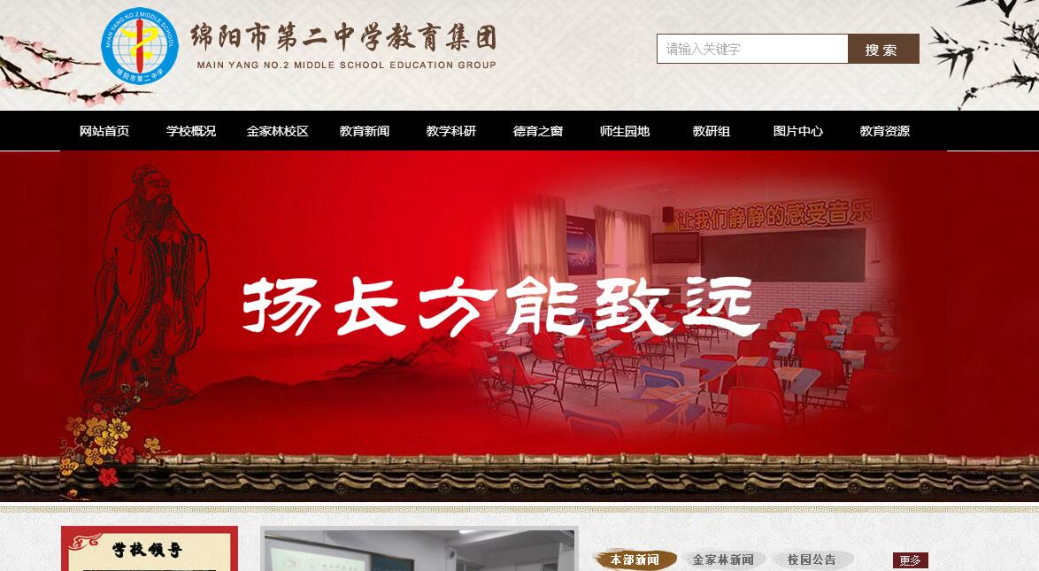 綿陽(yáng)市第二中學(xué)創(chuàng)辦于1957年,擁有50余年辦學(xué)歷史,是享譽(yù)省內(nèi)外的外語(yǔ)特色和藝體特色學(xué)校。學(xué)?,F(xiàn)有教職員工153人,達(dá)本科及本科以上學(xué)歷150人,研究生學(xué)歷3人,省級(jí)骨干教師3人,市級(jí)骨干教師12人,區(qū)級(jí)骨干教師13人。學(xué)校擁有功能齊全的現(xiàn)代化實(shí)驗(yàn)室5間,專用美術(shù)室、音樂室4間,電腦備課室2個(gè),多媒體網(wǎng)絡(luò)教室3個(gè),實(shí)現(xiàn)了互聯(lián)網(wǎng)、廣播網(wǎng)等多媒體網(wǎng)絡(luò)入課堂。近年來(lái),二中以“揚(yáng)長(zhǎng)教育”為理念,加快了打造“高質(zhì)量、規(guī)范化、有特色”的巴蜀名校的腳步。學(xué)校先后榮獲了“綿陽(yáng)市涪城名?!薄ⅰ熬d陽(yáng)市甲級(jí)校風(fēng)示范學(xué)?!?、“四川省校風(fēng)示范學(xué)校”、“四川省排球協(xié)會(huì)團(tuán)體會(huì)員單位”、“四川省籃球管理中心青少年籃球?qū)W?!?、“綿陽(yáng)市教育科研實(shí)驗(yàn)基地”、“綿陽(yáng)藝體教育窗口學(xué)?!?、“國(guó)家基礎(chǔ)教育實(shí)驗(yàn)中心外語(yǔ)實(shí)驗(yàn)學(xué)?!薄ⅰ皣?guó)家教育部人文社科項(xiàng)目實(shí)驗(yàn)學(xué)?!钡仁鈽s,并多次獲得省、市、區(qū)教育、教學(xué)、管理等方面一等獎(jiǎng),在2009年涪城區(qū)教育教學(xué)質(zhì)量表彰中,綿陽(yáng)二中囊獲了學(xué)校工作、教學(xué)質(zhì)量、德育工作、師培工作四項(xiàng)大獎(jiǎng),成為綿陽(yáng)基礎(chǔ)教育的一大“亮點(diǎn)”和涪城教育的一面“旗幟”。