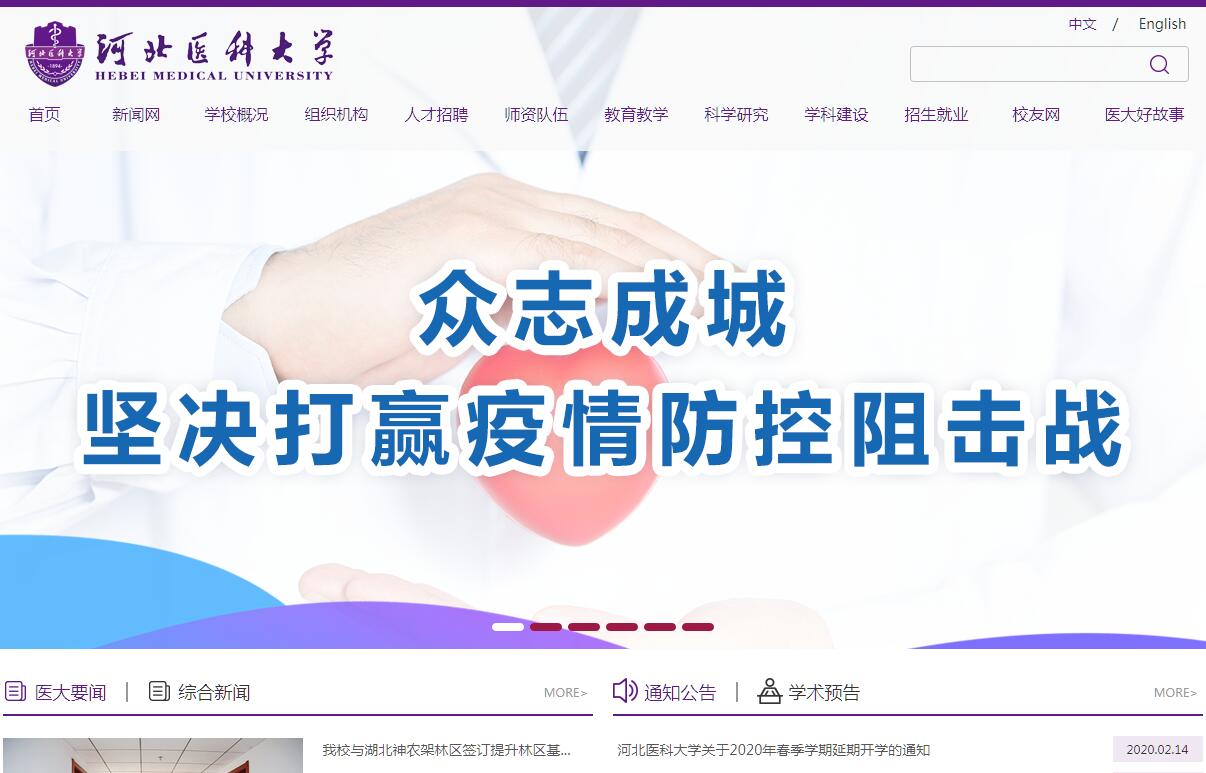 河北醫(yī)科大學是河北省重點骨干大學,初名北洋醫(yī)學堂,1894年由直隸總督北洋大臣李鴻章于天津創(chuàng)辦,是中國近代第一所官辦西醫(yī)院校。辛亥革命后,1912年10月民國教育部頒發(fā)第十六號令,據(jù)此北洋醫(yī)學堂1913年更名直隸公立醫(yī)學專門學校,并開始招收本科學生。1915年學校遷至保定。1937年7月7日抗日戰(zhàn)爭全面爆發(fā),學校被迫停辦。1946年1月復校招生。1949年4月更名為河北醫(yī)學院。1958年學校由保定遷至石家莊。1995年,原河北醫(yī)學院、河北中醫(yī)學院、石家莊醫(yī)學高等專科學校三校合并,改稱河北醫(yī)科大學。2013年河北中醫(yī)學院恢復獨立建制。2016年,教育部、國家衛(wèi)生計生委、河北省人民政府正式簽署共建河北醫(yī)科大學協(xié)議?!笆濉逼陂g,學校制定了“建設特色鮮明的高水平醫(yī)科大學”的發(fā)展目標。學校秉承“崇德、敬業(yè)、謹嚴、創(chuàng)新”的優(yōu)良校風,歷經(jīng)120年,特別是改革開放三十多年來的建設發(fā)展,已成為集教學、科研、醫(yī)療為一體的綜合性醫(yī)科大學。2005年學校提出了“明德博學 行方智圓”的校訓。2015年學校確立了“學生為本 教師為先”的辦學理念。目前,學校有兩個校區(qū)、五所直屬附屬醫(yī)院,下設18個二級學院,24個本科專業(yè),其中國家級特色專業(yè)4個,省級特色專業(yè)4個?,F(xiàn)有全日制在校生13795人,其中博士生、碩士生3418人,留學生413人。學校建有基礎醫(yī)學、臨床醫(yī)學、中西醫(yī)結合、生物學4個博士后科研流動站,具有基礎醫(yī)學、臨床醫(yī)學、生物學、公共衛(wèi)生與預防醫(yī)學、藥學、中西醫(yī)結合等6個一級學科博士學位授予權;52個學科具有碩士學位授予權,具備培養(yǎng)學士、碩士、博士及博士后的完整醫(yī)學教育體系。全校系統(tǒng)共有教職工15000余人(含直屬附屬醫(yī)院),其中正高職專業(yè)技術人員1096人,副高職專業(yè)技術人員1654人,博士生導師117人,碩士生導師1519人。在這支隊伍中有一批學識淵博、在國內外享有盛譽的專家教授,包括中國工程院院士4人,全國杰出專業(yè)技術人才1人,“萬人計劃”教學名師1名,國家百千萬人才工程人選4人,燕趙學者3人,河北省高端人才4人,國家級優(yōu)秀(模范)教師8名,河北省高等學校教學名師11人,享受國務院特殊津貼專家107名,省管優(yōu)秀專家60名,有突出貢獻的中青年專家111名。學校的5所直屬附屬醫(yī)院中,4所為三級甲等綜合性醫(yī)院,1所為三級??漆t(yī)院,編制床位9139張。另有5所非直屬附屬醫(yī)院、5所教學醫(yī)院和28個實習基地,教學床位達到25000張。學校不僅是河北省的醫(yī)學教育、醫(yī)療救治中心,也是河北省的醫(yī)學研究中心。設有國家級重點學科1個(中西醫(yī)結合基礎)、重點培育學科1個(法醫(yī)學)、國家中醫(yī)藥管理局重點學科1個(中西醫(yī)結合基礎),國家級臨床重點???6個,河北省“雙一流”建設學科4個,河北省國家重點學科培育項目支持學科1個,河北省強勢特色學科4個,省級重點學科12個,省部共建(教育部)重點實驗室2個,省級協(xié)同創(chuàng)新中心3個,省新型智庫1個,省哲學社會科學研究基地1個,省教育廳人文社會科學重點研究基地2個,省級重點實驗室、研究室、工程中心20個,省級研究所6個。此外,學校還承辦編輯出版了國家級及省級學術刊物8種。近年來,學校不斷加強國際交流與合作,已成為河北省對外文化、學術交流的重要窗口。先后與日本、韓國、美國、比利時、法國等12個國家的27所醫(yī)學院校和科研機構建立了密切的協(xié)作關系,聘請了百余名外國專家擔任學校的名譽職務,有留學生413人在校學習。此外,學校秉承大學服務于地方建設的宗旨,積極向地方政府與企業(yè)提供智力支持,先后與多家企事業(yè)單位簽署合作協(xié)議43項,合作內容涵蓋了人才培養(yǎng)、科學研究、生產(chǎn)服務等。