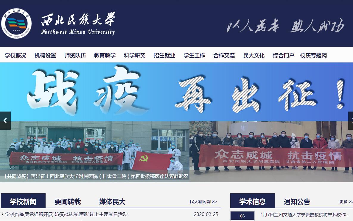 西北民族大學(xué)是中華人民共和國成立后創(chuàng)建的第一所民族高等學(xué)校,隸屬于國家民族事務(wù)委員會。學(xué)校肇始于1949年9月中國人民解放軍第一野戰(zhàn)軍在蘭州開辦的藏民問題研究班和藏民學(xué)校,1950年1月改建為西北人民革命大學(xué)蘭州分校第三部,1950年8月正式成立西北民族學(xué)院,2003年4月更名為西北民族大學(xué)。學(xué)校地處蘭州市,建有兩個校區(qū),校園總面積1776畝,其中西北新村校區(qū)359畝,榆中校區(qū)1417畝;建筑面積735645.33平方米;圖書資料394萬余冊;博物館館藏文物2964件;教學(xué)科研儀器設(shè)備總值4.1013億元,固定資產(chǎn)總額35.44286億元。2015年成為國家民委和教育部共建院校。2016年7月,國家民委和甘肅省人民政府簽署共建協(xié)議。2017年被列為甘肅省高水平大學(xué)建設(shè)單位。學(xué)校扎根西北大地辦大學(xué),始終堅持立德樹人的根本任務(wù),始終堅持為國家戰(zhàn)略和少數(shù)民族、民族地區(qū)經(jīng)濟社會發(fā)展服務(wù),始終堅持把為民族地區(qū)培養(yǎng)“下得去、用得上、留得下、靠得住、干得好”的專門人才作為使命自覺,已培養(yǎng)各類人才16萬余人。學(xué)校面向全國31個?。ㄊ小⒆灾螀^(qū))招生,現(xiàn)有56個民族全日制在校生26434人,其中本科生24248人,研究生1676人。2007年以“優(yōu)秀”成績通過教育部本科教學(xué)工作水平評估。學(xué)?,F(xiàn)設(shè)有28個教學(xué)單位:馬克思主義學(xué)院、經(jīng)濟學(xué)院、管理學(xué)院、法學(xué)院、民族學(xué)與社會學(xué)學(xué)院、教育科學(xué)與技術(shù)學(xué)院、體育學(xué)院、文學(xué)院、藏語言文化學(xué)院、蒙古語言文化學(xué)院、維吾爾語言文化學(xué)院、外國語學(xué)院、新聞傳播學(xué)院、音樂學(xué)院、舞蹈學(xué)院、美術(shù)學(xué)院、歷史文化學(xué)院、數(shù)學(xué)與計算機科學(xué)學(xué)院、電氣工程學(xué)院、土木工程學(xué)院、化工學(xué)院、生命科學(xué)與工程學(xué)院、醫(yī)學(xué)院、口腔醫(yī)學(xué)院(口腔醫(yī)院)、第一臨床醫(yī)學(xué)院、第二臨床醫(yī)學(xué)院、預(yù)科教育學(xué)院、繼續(xù)教育學(xué)院。學(xué)校設(shè)有3個獨立建制的科研機構(gòu):社會科學(xué)研究院、中國民族信息技術(shù)研究院、生物醫(yī)學(xué)研究中心。學(xué)校堅持人才強校戰(zhàn)略,建成了一支師德高尚、業(yè)務(wù)精湛、結(jié)構(gòu)合理、充滿活力的高素質(zhì)專業(yè)化教師隊伍?,F(xiàn)有教職工1926人,其中專任教師1241人,正高級職稱人員294人,副高級職稱人員601人,博士生導(dǎo)師24人,碩士生導(dǎo)師349人。教師中有“國家百千萬人才工程”人選1人,教育部“新世紀優(yōu)秀人才支持計劃”6人,享受國務(wù)院政府特殊津貼專家26人;國家民委突出貢獻專家9人,領(lǐng)軍人才6人,中青年英才培養(yǎng)計劃12人;甘肅省跨世紀學(xué)科帶頭人11人,領(lǐng)軍人才9人,優(yōu)秀專家5人,“333”科技人才工程人選10人,“555”創(chuàng)新人才工程人選6人;學(xué)校有全國優(yōu)秀教師2人,全國教育系統(tǒng)先進工作者1人,甘肅省教學(xué)名師6人,青年教師成才獎61人。學(xué)校有1個全國專業(yè)技術(shù)人才先進集體。學(xué)校是一所優(yōu)勢和特色比較鮮明的多學(xué)科門類的綜合性大學(xué)。學(xué)科涵蓋經(jīng)濟學(xué)、法學(xué)、教育學(xué)、文學(xué)、歷史學(xué)、理學(xué)、工學(xué)、農(nóng)學(xué)、醫(yī)學(xué)、管理學(xué)、藝術(shù)學(xué)等11個學(xué)科門類,擁有71個本科專業(yè),15個一級學(xué)科碩士學(xué)位授權(quán)點,2個二級學(xué)科碩士學(xué)位授權(quán)點,7個碩士專業(yè)學(xué)位類別和中國語言文學(xué)博士學(xué)位授權(quán)點、中國語言文學(xué)博士后科研流動站;具有推薦優(yōu)秀應(yīng)屆本科畢業(yè)生免試攻讀碩士研究生學(xué)位資格和招收“少數(shù)民族高層次骨干人才計劃”碩士、博士研究生資格,形成了以普通本科教育為主體,研究生教育、預(yù)科教育、繼續(xù)教育、職業(yè)教育和國際教育協(xié)調(diào)發(fā)展的辦學(xué)格局。學(xué)?,F(xiàn)有1個國家級教學(xué)團隊,8個省級教學(xué)團隊;1個國家級實驗教學(xué)示范中心,1個國家級虛擬仿真實驗教學(xué)中心,7個省級實驗教學(xué)示范中心;1個國家級專業(yè)綜合改革試點項目,1個國家級卓越農(nóng)林人才培養(yǎng)模式改革試點項目;4個國家級特色專業(yè),13個省級特色專業(yè);2門國家級精品視頻公開課,6門省級精品資源共享課,35門省級精品課程。學(xué)校現(xiàn)有19個省部級重點學(xué)科,其中,7個國家民委重點學(xué)科:中國少數(shù)民族經(jīng)濟、馬克思主義民族理論與政策、計算機應(yīng)用技術(shù)、社會學(xué)、應(yīng)用數(shù)學(xué)、法學(xué)、民族傳統(tǒng)體育學(xué);12個甘肅省重點學(xué)科:民族學(xué)、中國語言文學(xué)、中國史、計算機科學(xué)與技術(shù)、畜牧學(xué)、獸醫(yī)學(xué)、宗教學(xué)、民俗學(xué)、格薩爾學(xué)、馬克思主義理論、教育學(xué)、美術(shù)學(xué)。在甘肅省“雙一流”建設(shè)規(guī)劃中,民族學(xué)為一流學(xué)科建設(shè)優(yōu)勢學(xué)科,中國語言文學(xué)、計算機