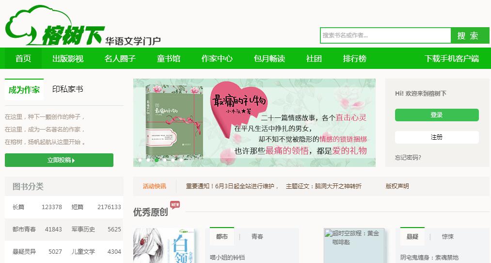 華語文學(xué)門戶-榕樹下(www.rongshuxia.com)是國內(nèi)歷史最悠久、最具品牌的文學(xué)類網(wǎng)站,創(chuàng)辦于1997年。2009年,盛大文學(xué)控股,重新打造新版“榕樹下”?!伴艠湎隆痹篃o數(shù)愛好文學(xué)的普通人好夢成真,并凝聚了一批在華語文學(xué)界極具影響力的作家,如韓寒、慕容雪村、寧財神、李尋歡、安妮寶貝、邢育森、蔡駿、今何在、郭敬明……“榕樹下”多次舉辦網(wǎng)絡(luò)文學(xué)大賽,余華、蘇童、王安憶、王朔、阿城、陳村、麥家、邱華棟、李敬澤等名家均曾出任大賽評委,吸引了全國各地媒體的關(guān)注,曾在文化界引發(fā)了以“榕樹下”為代表的“網(wǎng)絡(luò)文學(xué)”現(xiàn)象的全國大討論?!伴艠湎隆保侨蜃畲蟮脑瓌?chuàng)文學(xué)作品稿件庫之一,并與國內(nèi)多家出版社、平面媒體、新聞機(jī)構(gòu)、知名企業(yè)建立了良好的合作關(guān)系。2009年底,“榕樹下”宣布改版上線之后,在原來的原創(chuàng)文學(xué)網(wǎng)站基礎(chǔ)上,轉(zhuǎn)型為一個傳播文學(xué)、文化評論及原創(chuàng)寫作的權(quán)威綜合人文媒體,并定位于 華語文學(xué)領(lǐng)域的垂直門戶。并先后推出“民謠在路上”、“第四屆榕樹下網(wǎng)絡(luò)原創(chuàng)文學(xué)大展”、著名作家與文化名家專訪、組建“中國書評人天團(tuán)”等活動,獲得了 較大影響力。致力于為用戶提供網(wǎng)絡(luò)文學(xué)與實體出版書籍的閱讀、推薦、評價,業(yè)內(nèi)媒體資訊,文化娛樂社區(qū)等服務(wù);為原創(chuàng)作者提供提供完備的網(wǎng)絡(luò)發(fā)表及出版通 道,并將全面追蹤、研究華語文學(xué)的發(fā)展?!伴艠湎隆遍_始嘗試更多領(lǐng)域的文化傳播推廣事業(yè),為用戶量身打造全方位、廣角度、立體式的文化產(chǎn)品體驗;為出版社、游戲公司、影視機(jī)構(gòu)等版權(quán)需求 方提供大容量、多元化、優(yōu)品質(zhì)的作品來源?!伴艠湎隆睂⒅塾谡麄€文化市場,立足于各領(lǐng)域優(yōu)秀文化產(chǎn)品,致力于化解各種文化產(chǎn)品間的障礙,為用戶和版權(quán)方 提供文化服務(wù),全力搭建一個高密度文化平臺。