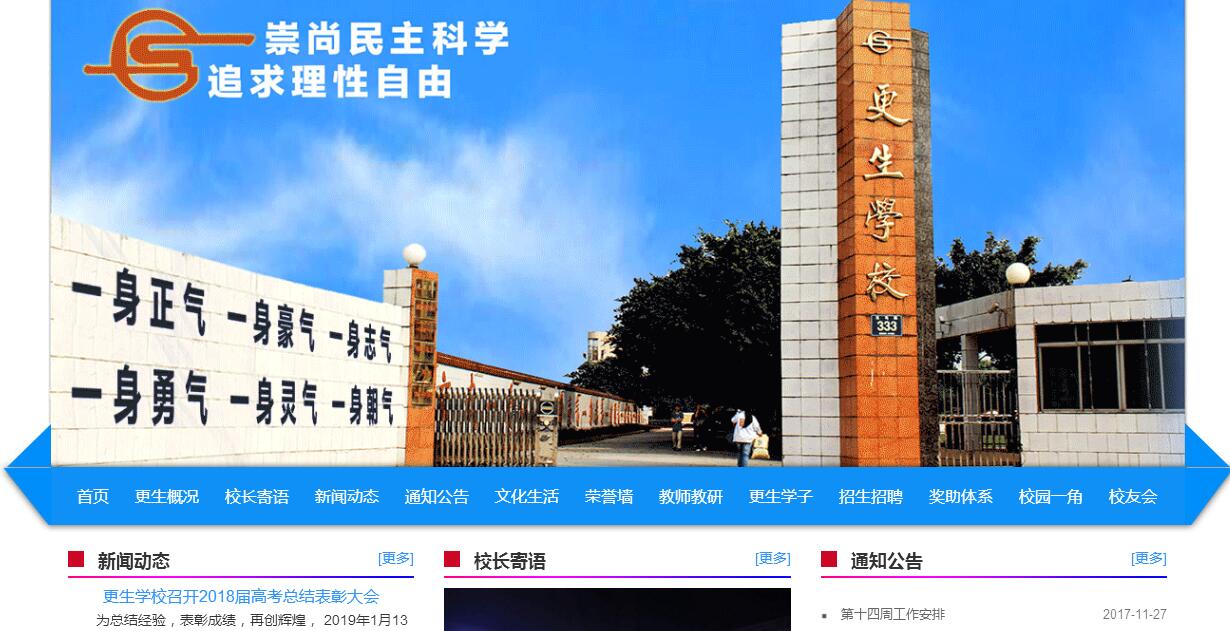 樂山市更生學(xué)校由一批追求教育理想,具有求實(shí)創(chuàng)新精神的中青年教師于1993年發(fā)起創(chuàng)辦,是一所實(shí)行小學(xué)、初中、高中一體化的全寄宿制的私立學(xué)校。學(xué)校命名“更生”,取自郭沫若先生的《鳳凰更生歌》,立意為民族、為人類培育新世紀(jì)新文化的創(chuàng)造者。學(xué)校占地60畝,環(huán)境優(yōu)美,教學(xué)設(shè)施先進(jìn)完善,現(xiàn)有44個(gè)教學(xué)班,學(xué)生2200多人,教職工200多人。學(xué)校立足于新世紀(jì)對(duì)人才的需要,實(shí)施養(yǎng)成教育、素質(zhì)教育、創(chuàng)新教育。立足于以人為本、以學(xué)生的發(fā)展為本的原則,從小學(xué)起開設(shè)英語、微機(jī)、形體、實(shí)用生活知識(shí)和各種興趣特長課,從小培養(yǎng)學(xué)生良好的心理素質(zhì)、意志品格、行為習(xí)慣、創(chuàng)新意趣和自尊自強(qiáng)、自理自立的能力。學(xué)校師資全部面向社會(huì)招聘。一支由省市優(yōu)秀教師組成的穩(wěn)定的、高素質(zhì)的師資隊(duì)伍,全身心投入教育教學(xué),為學(xué)生奉獻(xiàn)滿腔的愛心和豐富的知識(shí),形成了“特別關(guān)愛、特別認(rèn)真、特別嚴(yán)格、特別勤奮、特別文明、特別守紀(jì)”的教風(fēng)和學(xué)風(fēng),取得了令社會(huì)矚目的辦學(xué)成就。更生學(xué)校全新的辦學(xué)體制,獨(dú)特的辦學(xué)理念,顯著的教育教學(xué)效果,贏得了家長和社會(huì)的信賴和贊譽(yù)。學(xué)校被授予校風(fēng)示范校、心理健康特色學(xué)校、依法治校先進(jìn)單位,連續(xù)被評(píng)為省民辦教育先進(jìn)單位。校長阮平被評(píng)為四川省社會(huì)力量辦學(xué)先進(jìn)個(gè)人,樂山市優(yōu)秀教育工作者。更生學(xué)校的主要辦學(xué)特色:封閉管理 教風(fēng)嚴(yán)謹(jǐn)學(xué)風(fēng)淳樸。學(xué)校辦學(xué)24年來,一直實(shí)行全寄宿制封閉式管理,所有學(xué)生一律住校,已形成一整套科學(xué)的寄宿制封閉管理的經(jīng)驗(yàn)。學(xué)校管理嚴(yán)而不死、活而不亂,既體現(xiàn)人文關(guān)懷、主動(dòng)參與,充分調(diào)動(dòng)學(xué)生生動(dòng)活潑發(fā)展,又使學(xué)生少受各種不良因素干擾,靜下心來集中精力努力學(xué)習(xí),去實(shí)現(xiàn)自己的遠(yuǎn)大理想。學(xué)校以積極向上、勤奮學(xué)習(xí)、嚴(yán)謹(jǐn)淳樸、言行文明的校風(fēng)著稱。低進(jìn)高出 學(xué)生成績提升顯著。更生教學(xué)質(zhì)量高,高中入口起點(diǎn)低,畢業(yè)出口提升大。經(jīng)過三年的學(xué)習(xí)鍛煉,絕大多數(shù)學(xué)生都在這里取得了顯著進(jìn)步。1999年首屆高中畢業(yè)生參加高考,即獲得優(yōu)異成績。2000—2006年連續(xù)7屆高考本科硬上線率居市中區(qū)境內(nèi)第二。2006—2017年連續(xù)12屆高考本科硬上線人數(shù)居市中區(qū)境內(nèi)第二。歷屆畢業(yè)學(xué)生考入清華大學(xué)、中國人民大學(xué)、北京師范大學(xué)、南開大學(xué)、同濟(jì)大學(xué)、武漢大學(xué)、南京大學(xué)、中山大學(xué)、山東大學(xué)、吉林大學(xué)、四川大學(xué)、電子科技大學(xué)等著名高校的,累計(jì)已達(dá)800余人。學(xué)校連續(xù)8年獲得市、區(qū)高中教育質(zhì)量最高等級(jí)獎(jiǎng),并獲市中區(qū)人民政府高中教育質(zhì)量“優(yōu)生鞏固獎(jiǎng)”、高中教育質(zhì)量“突出貢獻(xiàn)獎(jiǎng)”。扶貧助優(yōu) 激勵(lì)成長奉獻(xiàn)社會(huì)。更生學(xué)校體制優(yōu)越,機(jī)制靈活,實(shí)施競爭激勵(lì)機(jī)制極大調(diào)動(dòng)師生教和學(xué)的積極性。學(xué)校按國家相關(guān)政策向?qū)W生頒發(fā)國家助學(xué)金。每期對(duì)25%左右的學(xué)生頒發(fā)250元——3000元的獎(jiǎng)學(xué)金,以此培養(yǎng)學(xué)生勇于挑戰(zhàn)、敢于競爭的精神和自尊自信、自助自立、自強(qiáng)自創(chuàng)的意識(shí)和能力。對(duì)品學(xué)兼優(yōu)的貧困生還另外發(fā)給生活補(bǔ)貼,幫助其完成高中學(xué)業(yè)。更生學(xué)校通過獎(jiǎng)學(xué)金和補(bǔ)貼金助學(xué)的途徑,已實(shí)實(shí)在在地扶助了上千名貧困學(xué)生考上理想大學(xué)。現(xiàn)在受到更生學(xué)校扶助的在校學(xué)生超過600人。人格塑造 學(xué)生發(fā)展后勁十足。更生學(xué)校不僅關(guān)注并著力于學(xué)生的成績提高,更注重學(xué)生的人格塑造心態(tài)培養(yǎng)。因?yàn)槌煽兎謹(jǐn)?shù)只決定學(xué)生的升學(xué)錄取,人格心態(tài)才決定人的長遠(yuǎn)發(fā)展和終身幸福。更生學(xué)校自辦學(xué)以來,一直致力于學(xué)生“正直、勤奮、文明、智慧、健康、快樂”人格的塑造,注重于學(xué)生積極進(jìn)取、樂觀向上、獨(dú)立探索、大膽質(zhì)疑、敢于競爭、不怕挫折的良好心態(tài)的培養(yǎng),用心于學(xué)生“正氣、豪氣、志氣、勇氣、靈氣、朝氣——人生浩然大氣”的培育,不僅使大多數(shù)更生學(xué)子在高中階段成績迅速提升,跨越2、3個(gè)臺(tái)階考入理想的大學(xué),更使眾多更生學(xué)子考上大學(xué)進(jìn)入社會(huì)能迅速適應(yīng),游刃有余地活躍于大學(xué)和社會(huì)舞臺(tái),獲得強(qiáng)勁的后發(fā)力量。更生學(xué)子大學(xué)畢業(y