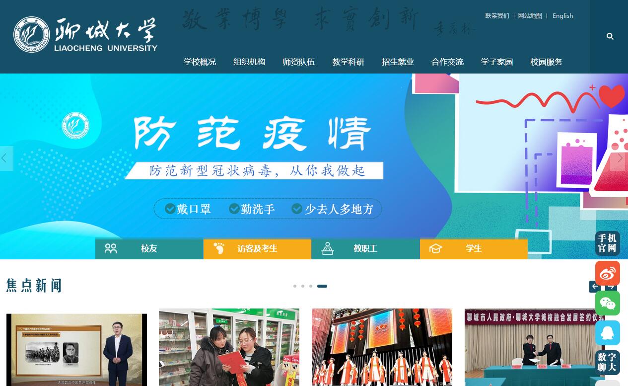 聊城大學坐落于國家級歷史文化名城——山東省聊城市,是山東省屬重點綜合性大學。學校辦學歷史可追溯到1902年山東大學堂內(nèi)設(shè)的師范館。1970年山東師范學院遷至聊城辦學,1974年山東師范學院聊城分院建立,1981年經(jīng)國務(wù)院批準更名為聊城師范學院,2002年經(jīng)教育部批準更名為聊城大學。2012年學校被確定為山東省首批應(yīng)用型人才培養(yǎng)特色名校。學校擁有碩士、學士學位授予權(quán),具有碩士研究生推免資格,并與海內(nèi)外諸多高校合作培養(yǎng)博士學位研究生。傳承百年辦學傳統(tǒng),獨立辦學近半個世紀,學校秉承“敬業(yè)、博學、求實、創(chuàng)新”的校訓,發(fā)揚“崇教、尚學、敦厚、奮進”的聊大精神,為國家建設(shè)和經(jīng)濟社會發(fā)展培養(yǎng)了大批優(yōu)秀人才,近20萬名校友遍布海內(nèi)外。學?,F(xiàn)設(shè)25個學院,9個研究院所,21個一級學科碩士學位授權(quán)點,8個碩士專業(yè)學位授權(quán)點, 95個本科專業(yè)。學科專業(yè)涵蓋哲學、經(jīng)濟學、法學、教育學、文學、歷史學、理學、工學、農(nóng)學、管理學、藝術(shù)學、醫(yī)學等12大學科門類,全日制在校本科生、研究生、留學生30000余人。學?,F(xiàn)有教職工2108人,其中教授227人,副教授559人。現(xiàn)有國家“千人計劃”專家2人,“泰山學者”特聘專家、海外特聘專家7人,海外高層次專家8人,教育部教學指導委員會委員1人,享受國務(wù)院政府特殊津貼專家11人,全國優(yōu)秀教師5人,曾憲梓教育基金會高等師范院校優(yōu)秀教師獎獲得者8人,教育部新世紀優(yōu)秀人才支持計劃1人,全國師德標兵1人,全國優(yōu)秀教育工作者1人,山東省有突出貢獻的中青年專家、智庫高端專家、高等學校首席專家、齊魯文化英才等24人,山東省教學名師、優(yōu)秀教師、優(yōu)秀思想政治工作者37人,國家級教學團隊1個,省級優(yōu)秀教學團隊6個。聘請中國科學院吳培亨院士、魏江春院士、石鐘慈院士等為學?!半p聘院士”。學校擁有教育部國別和區(qū)域研究機構(gòu)1個,共建有1個國家實驗室,2個國家工程技術(shù)研究中心,山東省一流學科立項建設(shè)學科1個,山東省重點學科10個,山東省重點實驗室2個,山東省工程技術(shù)研究中心2個,山東省哲學社會科學規(guī)劃研究基地3個,山東省重點新型智庫1個,山東省理論工程重點研究基地1個,山東省軟科學研究基地1個,山東省高校重點實驗室3個,山東省重點人文社科研究基地2個,5個“十三五”山東省高??蒲袆?chuàng)新研究平臺,山東省高校優(yōu)勢科研創(chuàng)新團隊1個,山東省協(xié)同創(chuàng)新中心1個,培育協(xié)同創(chuàng)新中心2個,山東省高校優(yōu)勢學科人才團隊1個。近年來,獲批國家級課題239項,省部級課題476項,138項科研成果分獲“國家科學技術(shù)進步獎”“教育部高等學??茖W研究優(yōu)秀成果獎(科學技術(shù))”“教育部高等學校科學研究優(yōu)秀成果獎(人文社會科學)”“全國教育科學研究優(yōu)秀成果一等獎”等省部級以上科研獎勵。學校建有國家級特色專業(yè)4個,教育部“卓越農(nóng)林人才教育培養(yǎng)計劃”1個,山東省“卓越工程師教育培養(yǎng)計劃”3個,山東省高水平應(yīng)用型立項建設(shè)專業(yè)(群)8個,山東省應(yīng)用型人才培養(yǎng)特色名校省級重點建設(shè)專業(yè)24個,省級品牌特色專業(yè)12個;國家級精品課程1門,國家級雙語教學示范課程1門,國家級精品視頻公開課3門。全國首屆教學成果一等獎1項,國家教學成果獎二等獎4項,省級教學成果獎82項。省部級及以上教研教改課題41項,國家級規(guī)劃教材3部?!疤魬?zhàn)杯”全國大學生課外學術(shù)科技作品競賽、國際大學生數(shù)學建模競賽、微軟辦公軟件核心技能世界大賽、“創(chuàng)青春”全國大學生創(chuàng)業(yè)大賽、中華龍舟大賽等各項競賽活動中,我校學子每年獲得獎勵5000余人次,其中冠軍或一等獎獲得者達幾百人次。2007年教育部本科教學工作水平評估成績優(yōu)秀。學校堅持開放式辦學理念,積極開展國際合作與交流,國際化辦學水平不斷提高。與20多個國家及中國港澳臺地區(qū)的60多所高校建立了校際關(guān)系,開展了包括教師交流、學生交流、合作辦學等在內(nèi)的30多個交流合作項目,常年開展學生交換留學項目。與約旦費城大學、薩摩亞國立大學合作開辦孔子學院。學校占地面積3000畝,校舍面積75.3萬余平方米,教學科研儀器設(shè)備總值3.6億元。東西校區(qū)兩個圖書館總面積49500平方米,共有30多個書庫和閱覽室,閱覽座位6000余個,現(xiàn)有紙質(zhì)藏書243萬冊,中外文期刊1950種,電子圖書263萬余種,電子期刊194萬種,各類中外文數(shù)據(jù)庫55個。校園環(huán)境優(yōu)雅,湖光山色,四季常青,是讀書治學的理想場所。教學相長、學風濃郁,享有“學在聊大”的美譽。學校先后榮獲“全國綠化模范單位”“全國廠務(wù)公開民主管理先進單位”“全國大學生社會實踐先進單位”“全國大學生志愿服務(wù)西部優(yōu)秀項目辦”“全國大學生心理健康教育先進單位”“全國示范文學校園”“中國最美校歌”“濟南軍區(qū)國防生培養(yǎng)工作特別獎”“山東省教育先進單位”“山東省文明校園”等榮譽稱號。學校堅持“質(zhì)量立校、人才強校、學術(shù)
