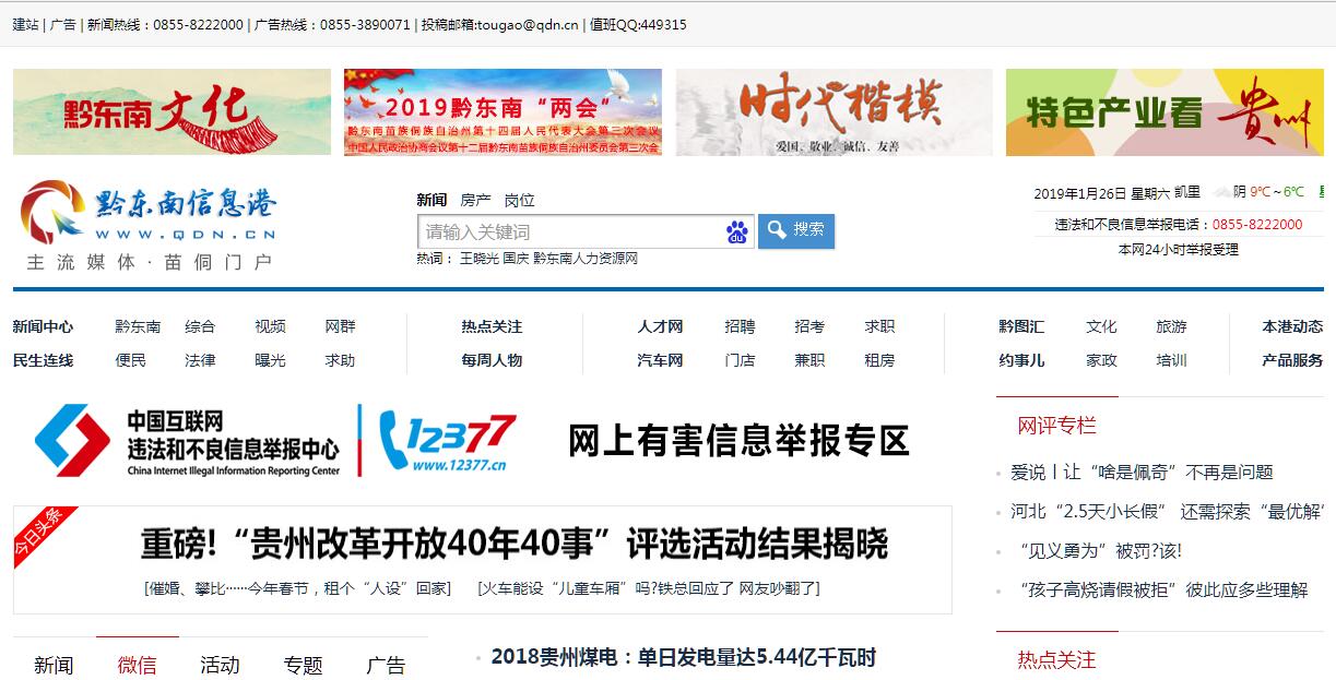 黔東南信息港,黔東南人自己的網(wǎng)站,新興的第四代媒體。黔東南最大、最權(quán)威、最專業(yè)的網(wǎng)絡(luò)媒體www.qdn.cn,最新最快最廣傳播黔東南時(shí)政、動(dòng)態(tài)、信息。黔東南信息港成立于2003年8月,是中共黔東南州委宣傳部、黔東南州人民政府新聞辦、中共黔東南州委外宣辦主管下的黔東南最大的一個(gè)門戶網(wǎng)站,是對內(nèi)和對外展示宣傳黔東南的一個(gè)重要窗口和平臺。建設(shè)數(shù)字化黔東南,打造黔東南 “新聞眼”、“信息眼”。黔東南信息港主要擔(dān)負(fù)著黔東南州黨政和人民耳目喉舌、對外宣傳、信息總匯等職能,并通過互聯(lián)網(wǎng)平臺發(fā)揮傳播職能。黔東南信息港設(shè)置有“黔東南新聞”、“百姓呼聲”、“曝光臺”、“人物訪談”、“文學(xué)村”、“信息”等10多個(gè)欄目,全方位、多角度地宣傳黔東南的時(shí)政時(shí)事、社會動(dòng)態(tài)、重大活動(dòng)、人文史實(shí)、民風(fēng)民俗、自然風(fēng)光、景區(qū)景點(diǎn)等,關(guān)注民生、聚焦社會熱點(diǎn)、反映百姓呼聲、傳播先進(jìn)文化、把握市場脈搏。黔東南信息港編輯部已經(jīng)形成多渠道、多層次、多功能的新聞信息發(fā)布體系,每日均發(fā)布新聞信息20多條,圖片10多張,向全世界宣傳黔東南的時(shí)事、資源、旅游、文化、人文等,成為黔東南州對外宣傳的一個(gè)重要陣地。完成了州委、州政府下達(dá)的凱里“文明城市”創(chuàng)建、凱里“全國優(yōu)秀旅游城市”創(chuàng)建、凱里國際蘆笙節(jié)、臺江“姊妹節(jié)”、雷山“苗年節(jié)”、黎從榕“侗族大歌節(jié)”、“多彩貴州”、黎平機(jī)場通航、黔東南州建州50周年大慶、凱里原生態(tài)民族文化節(jié)等活動(dòng)的對外宣傳任務(wù)。黔東南信息港技術(shù)部從事網(wǎng)站建設(shè)維護(hù)、系統(tǒng)開發(fā)、廣告制作。黔東南信息港市場部構(gòu)建黔東南網(wǎng)絡(luò)市場和咨訊市場,專業(yè)從事廣告發(fā)布、企業(yè)包裝、品牌推廣、精品策劃、理念展示等。從2003年8月至今五年多來,黔東南信息港總訪問量已達(dá)2000多萬人次,平均每天2萬多人次。在中國網(wǎng)站排名貴州地區(qū)網(wǎng)站中居前10位,排前列。目前在黔東南所有網(wǎng)站中排名第一。
