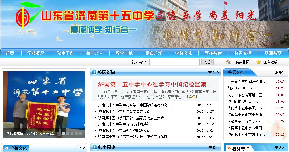 濟(jì)南第十五中學(xué)是一所具有70年辦學(xué)歷史的學(xué)校,始建于一九四九年,原名濟(jì)南工人子弟中學(xué),由時(shí)任濟(jì)南市市長(zhǎng)姚仲明主持籌建并擔(dān)任名譽(yù)校長(zhǎng)。一九五六年改現(xiàn)名山東省濟(jì)南第十五中學(xué),一九八二年改名濟(jì)南師范??茖W(xué)校附屬中學(xué),一九八九年恢復(fù)山東省濟(jì)南第十五中學(xué)校名。學(xué)校校舍占地面積20009平方米,建筑面積11612平方米,其中教學(xué)實(shí)驗(yàn)樓6475平方米,辦公綜合樓4100余平方米。學(xué)校有200米環(huán)形塑膠跑道、百米直道的標(biāo)準(zhǔn)運(yùn)動(dòng)場(chǎng)地和籃球排球場(chǎng)地,配有各種體育健身器材。有語音室、多媒體教室、微機(jī)室、物理實(shí)驗(yàn)室、化學(xué)實(shí)驗(yàn)室、生物實(shí)驗(yàn)室、音樂、美術(shù)教室、圖書室、閱覽室等各類專用教室,建有生態(tài)觀賞園一處,有可各容納300人的階梯教室和報(bào)告廳。學(xué)校先后獲得濟(jì)南市文明單位、市級(jí)規(guī)范化學(xué)校、市家長(zhǎng)滿意學(xué)校、市德育工作先進(jìn)單位,市綠色學(xué)校,市語言文字先進(jìn)集體,平安濟(jì)南建設(shè)先進(jìn)基層單位,安全工作四星級(jí)單位。是省級(jí)體育傳統(tǒng)項(xiàng)目學(xué)校,山東省心理健康教育先進(jìn)單位,省級(jí)衛(wèi)生先進(jìn)單位,全省消防安全教育示范學(xué)校,實(shí)踐科學(xué)發(fā)展觀活動(dòng)“省級(jí)先進(jìn)單位”, 濟(jì)南市先進(jìn)基層黨校,市教育局黨委先進(jìn)基層黨組織,市行風(fēng)建設(shè)先進(jìn)單位, 市依法治校示范校,市教育系統(tǒng)黨風(fēng)廉政建設(shè)先進(jìn)單位,市教育新聞宣傳工作先進(jìn)集體等榮譽(yù),辦學(xué)質(zhì)量和師生的精神面貌得到社會(huì)、社區(qū)、家長(zhǎng)的認(rèn)可和好評(píng)。