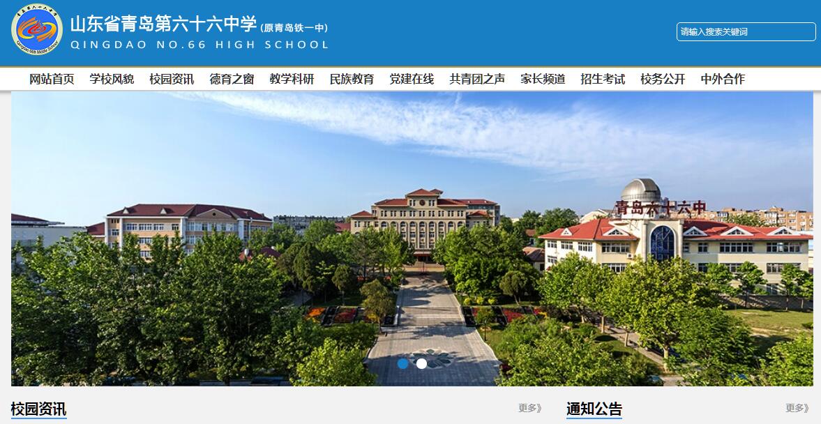 青島六十六中原名青島鐵一中,創(chuàng)建于1925年,2002年12月移交青島市教育局管理,2003年7月更名為山東省青島第六十六中學(xué)。學(xué)校在九十三年的辦學(xué)歷程中積淀了深厚的文化底蘊,先后被評為山東省規(guī)范化學(xué)校、全國體育先進單位、山東省藝術(shù)教育示范學(xué)校、山東省電化教學(xué)示范學(xué)校、山東省體育傳統(tǒng)項目學(xué)校、全國足球特色學(xué)校、青島市中小學(xué)德育工作先進集體、山東省教育援藏援疆先進單位、山東省民族團結(jié)進步創(chuàng)建示范單位等。近年來,學(xué)校秉持“讓每一位學(xué)生實現(xiàn)心中的夢想”辦學(xué)理念,以教師發(fā)展為關(guān)鍵,以學(xué)生發(fā)展為根本,全面提升教育教學(xué)質(zhì)量,實現(xiàn)學(xué)??缭绞桨l(fā)展。自2005年開始,學(xué)校承辦新疆內(nèi)高班辦班任務(wù),民族團結(jié)教育成效顯著;2015年起招收俄語班,與莫斯科國立大學(xué)等俄羅斯大學(xué)合作,踐行教育“一帶一路”行動;2016年招收綜合育人班,創(chuàng)新人才培養(yǎng)模式。學(xué)校堅持多元開放辦學(xué)思路,開設(shè)美術(shù)、藝術(shù)、啦啦操、音樂編導(dǎo)、播音主持、體育項目等課程供學(xué)生選擇,多樣化特色辦學(xué)全面開花結(jié)果;堅持優(yōu)質(zhì)師資隊伍的打造,逐漸形成一支年富力強、敬業(yè)樂教、愛生奉獻的教師隊伍。青島六十六中正全力以赴,為學(xué)生的全面發(fā)展搭建最好的平臺,讓志存高遠的莘莘學(xué)子在這里實現(xiàn)絢麗的人生夢想!