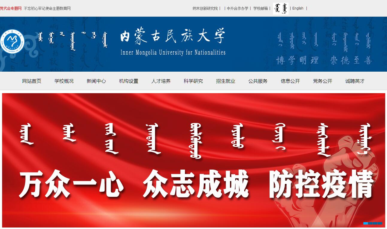 內(nèi)蒙古民族大學(xué)始建于1958年,2000年由原內(nèi)蒙古民族師范學(xué)院、內(nèi)蒙古蒙醫(yī)學(xué)院、哲里木畜牧學(xué)院合并組建而成,是內(nèi)蒙古自治區(qū)重點建設(shè)高校,內(nèi)蒙古自治區(qū)人民政府和國家民族事務(wù)委員會共建高校,也是國家“十三五”中西部高?;A(chǔ)能力建設(shè)工程(二期)支持高校。經(jīng)過60年的建設(shè)與發(fā)展,學(xué)?,F(xiàn)已發(fā)展成為一所學(xué)科門類齊全、師資力量較為雄厚、教學(xué)設(shè)施相對完善、辦學(xué)形式多樣、教學(xué)質(zhì)量優(yōu)良、辦學(xué)特色鮮明的綜合性民族大學(xué),累計培養(yǎng)各類人才18萬余名,為國家和民族地區(qū)經(jīng)濟社會發(fā)展和穩(wěn)定做出了重要貢獻。學(xué)校位于內(nèi)蒙古自治區(qū)東部,坐落在被譽為“科爾沁草原明珠”的通遼市,擁有霍林河、西拉木倫2個校區(qū),占地面積104.34萬平方米,建筑面積53.24萬平方米,校舍建筑面積39.96萬平方米,固定資產(chǎn)總值9.6億元,教學(xué)科研儀器設(shè)備總值2.94億元,館藏紙質(zhì)圖書167.8萬余冊。學(xué)校設(shè)有27個教學(xué)單位、6個教輔單位、1個附屬單位,開設(shè)本科專業(yè)76個,涵蓋了經(jīng)濟學(xué)、法學(xué)、教育學(xué)、文學(xué)、歷史學(xué)、理學(xué)、工學(xué)、農(nóng)學(xué)、醫(yī)學(xué)、管理學(xué)、藝術(shù)學(xué)等11個學(xué)科門類。有服務(wù)國家特殊需求蒙藥學(xué)博士人才項目1個,碩士學(xué)位授權(quán)一級學(xué)科17個,有專業(yè)碩士學(xué)位授權(quán)點7個,具有教授自評權(quán)?,F(xiàn)有全日制在校學(xué)生22059人,其中普通本科學(xué)生 20835人、普通專科學(xué)生391人、少數(shù)民族預(yù)科學(xué)生119人、碩士研究生820人、博士研究生13人、留學(xué)生457人,有教職工1747人,其中專任教師1190人,具有高級職稱教師760人,具有博士學(xué)位教師295人。另有附屬醫(yī)院職工1475人,其中醫(yī)生475人,具有正高級職稱103人。在教師隊伍中,享受國務(wù)院政府特殊津貼專家19人,全國先進工作者1人、全國“五一”勞動獎?wù)芦@得者2人、全國優(yōu)秀教師2人、全國高校優(yōu)秀思想政治理論課教師1人、全國高等學(xué)校教學(xué)指導(dǎo)委員會委員2人。學(xué)校實施了“柔性引進人才計劃”,引進高層次人才 123人次,其中院士3名、社科院學(xué)部委員2名、“長江學(xué)者”3名、國家杰青1名;實施“科爾沁學(xué)者”計劃,評選十屆“科爾沁學(xué)者”共319人次;實施了“示范課教師計劃”,已評選四屆38人?,F(xiàn)有國家級教學(xué)團隊1個,有國家級特色專業(yè)3個、綜合改革試點專業(yè)1個、“卓越醫(yī)生(中醫(yī))教育培養(yǎng)計劃”項目專業(yè)1個、產(chǎn)學(xué)合作專業(yè)綜合改革試點項目1個,有國家級實驗教學(xué)示范中心1個、大學(xué)生校外實踐教育基地1個、大學(xué)生創(chuàng)新創(chuàng)業(yè)訓(xùn)練基地1個,有自治區(qū)級綜合改革試點專業(yè)1個、重點建設(shè)專業(yè)4個、品牌專業(yè)17個、實驗教學(xué)示范中心4個、精品課程39門、教學(xué)團隊11個。獲國家級教學(xué)成果二等獎1項,自治區(qū)級教學(xué)成果一、二、三等獎共29項。學(xué)校有省部級重點學(xué)科(含重點培育學(xué)科)16個;有省部級科研平臺17個,其中國家民委—教育部重點實驗室1個,自治區(qū)級重點實驗室(工程中心)8個,國家民委人文社會科學(xué)研究基地 1個,全國社會科學(xué)普及基地 1個,國家體育總局研究基地1個,自治區(qū)研究基地5個。有省部級協(xié)同創(chuàng)新中心1個,省部級科技創(chuàng)新團隊4個?!笆濉币詠?,獲國家社會科學(xué)基金項目57項,國家自然科學(xué)基金項目99項,被SCI、EI、CPCI檢索論文760篇,獲國家科技進步二等獎1項,自治區(qū)級各類科研獎勵47項。有6個版本的學(xué)報在國內(nèi)外公開發(fā)行,其中社會科學(xué)版(漢文)為中國人文社會科學(xué)核心期刊(擴展版),《民族高等教育研究》是全國首個研究民族高等教育的專業(yè)期刊。學(xué)校是中國政府獎學(xué)金來華留學(xué)生培養(yǎng)單位,與俄羅斯布里亞特國立農(nóng)業(yè)大學(xué)、蒙古國國立醫(yī)科大學(xué)、美國杰克遜威爾州立大學(xué)、澳大利亞紐卡斯爾大學(xué)、日本上越教育大學(xué)、韓國江原大學(xué)等28所國外高校和機構(gòu)建立了友好合作關(guān)系。其中與蒙古國國立醫(yī)科大學(xué)的合作交流成效顯著,在蒙古國共建了蒙藥研發(fā)工程重點實驗室、蒙藥制藥廠、合作國際蒙醫(yī)醫(yī)院和蒙藥聯(lián)合研究中心。學(xué)校是國家留學(xué)基金委“國際本科學(xué)術(shù)互認課程(ISEC)”項目培養(yǎng)單位,開設(shè)“ISEC”項目專業(yè)6個。與美國托馬斯大學(xué)開展了護理學(xué)本科專業(yè)雙學(xué)士學(xué)位聯(lián)合培養(yǎng)項目。蒙醫(yī)藥是我校特色學(xué)科和優(yōu)勢學(xué)科,2012年蒙藥學(xué)獲批服務(wù)國家特殊需求人才博士點培養(yǎng)項目,2015年蒙醫(yī)學(xué)專業(yè)獲批教育部“卓越醫(yī)生培養(yǎng)計劃”,獲國家級科研項目300余項、經(jīng)費達到8000余萬元,在學(xué)科建設(shè)、人才培養(yǎng)和產(chǎn)學(xué)研結(jié)合等方面處于國內(nèi)外領(lǐng)先地位,成為我國蒙醫(