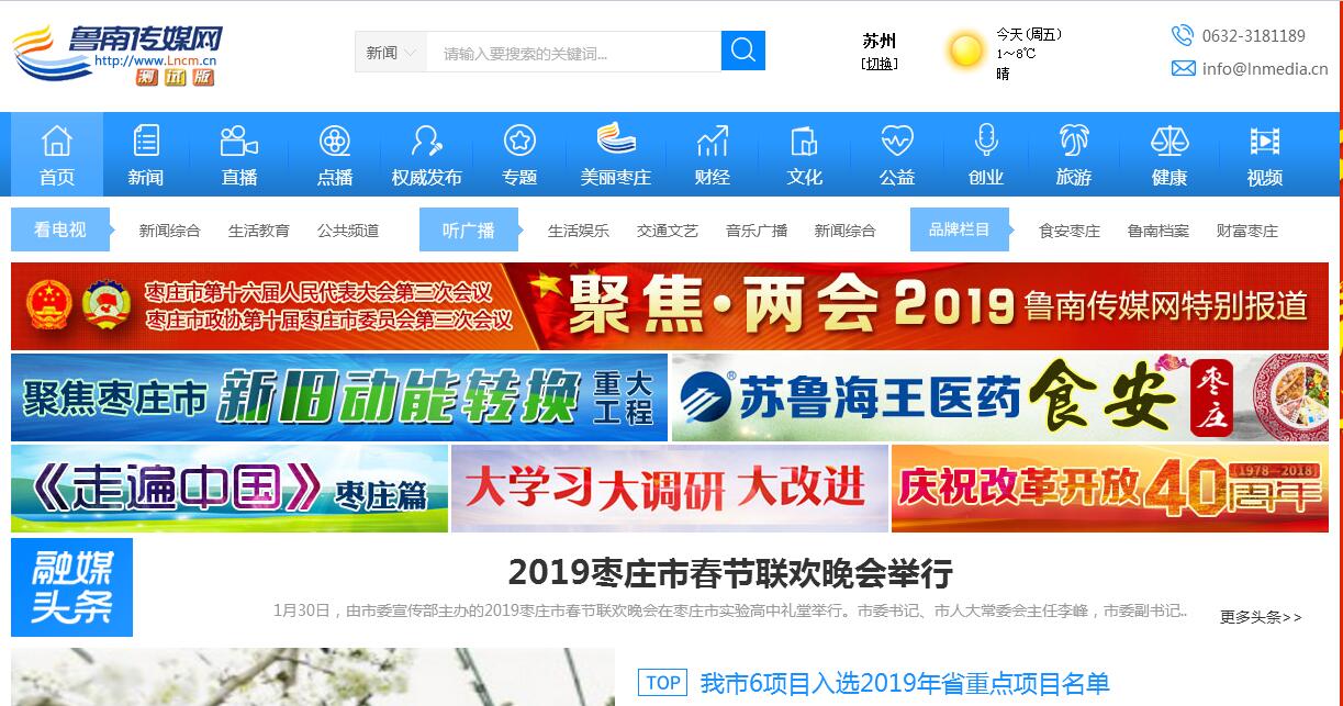| 網站簡介: 魯南傳媒網是山東省政府新聞辦公室批準設立,由棗莊市委、市政府主管,棗莊廣播電視臺主辦,是本地最大的集網絡視聽、資訊服務為中心的第一新聞視聽綜合門戶網站。魯南傳媒網本著區(qū)域性、權威性、功能性、服務性、接地氣、走市場的理念,整合了棗莊廣播電臺、電視臺優(yōu)勢資源,以新聞宣傳為龍頭、資訊服務為核心、視聽互動為特色,立足棗莊,是對外宣傳的主要窗口。魯南傳媒網開設了一系列與網民溝通的交流平臺,如網上民聲、爆料臺、微博、微信等,為廣大網民提供更方便、快捷、優(yōu)質的服務。 |