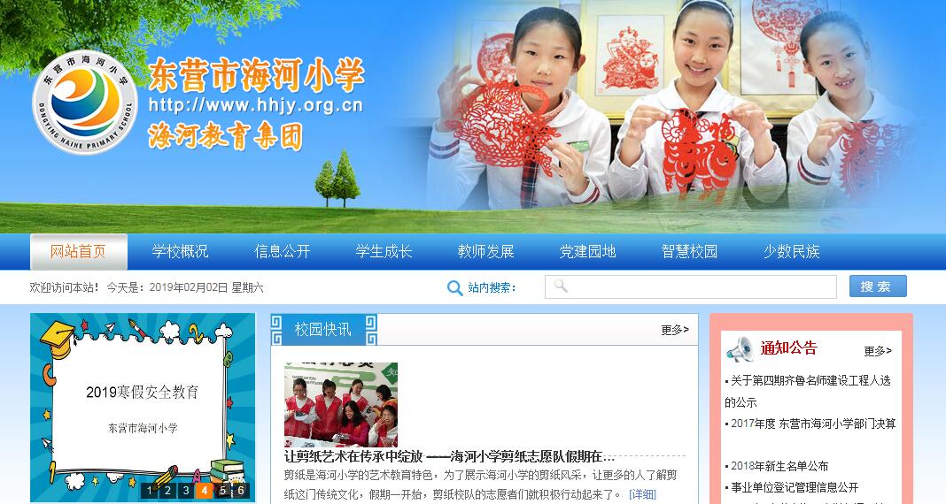 在共和國最年輕的土地——黃河三角洲上,教育園圃里升騰起一顆璀璨的新星——東營市海河小學(xué)。學(xué)校創(chuàng)辦于1995年,是一所公辦市直小學(xué),隸屬于東營市教育局,位于東營市東營區(qū)遼河路131號。學(xué)校占地4公頃,建筑面積14700平方米,學(xué)?,F(xiàn)有教職工126名。2015年9月,與學(xué)校東營經(jīng)濟開發(fā)區(qū)的分校東凱第二小學(xué)組建海河教育集團,分?,F(xiàn)有教職工50人,占地3公頃,建筑面積11000平方米。教育基于生命,生命融入教育,這是教育的本質(zhì)。為此,我校把生命幸福教育作為辦學(xué)思想,把“納潤生命,養(yǎng)正塑品”作為核心辦學(xué)理念。構(gòu)建生命幸福成長課程,打好學(xué)生生命底色;建設(shè)“和諧、高效、溫暖、生動”的生命課堂,關(guān)注師生共同成長;培育生命品格教師,促進(jìn)教師專業(yè)化發(fā)展;開展小班化教育試點,實現(xiàn)“少一半的學(xué)生,多一倍的關(guān)愛”; 開展豐富多彩的社團活動,提升學(xué)生生命質(zhì)量;舉辦海河分校,讓更多的孩子享受生命幸福教育。我們的愿景是讓每一個生命綻放幸福光彩。學(xué)校始終堅持“教師發(fā)展保障學(xué)生發(fā)展,讓教師和學(xué)生共同成長”的工作思路,通過實施“教師梯級培養(yǎng)工程”、“讀書工程”、“基本功提升工程”、“名師帶徒工程”,著力打造“教師博客群”、“校本教研網(wǎng)”、“學(xué)科教學(xué)研究會”等研修平臺,促進(jìn)教師專業(yè)成長,打造了一支思想水平高、業(yè)務(wù)能力強、師德師風(fēng)好的教師隊伍。涌現(xiàn)出全國優(yōu)秀教師3人,全國優(yōu)秀少先隊輔導(dǎo)員1人,國家級骨干教師(校長)3人;山東省特級教師2人,省優(yōu)秀教師、省級教學(xué)能手、省級骨干教師、省創(chuàng)新人物20人;東營市有突出貢獻(xiàn)的中青年專家1人,市特級教師、市勞模、市名師、市優(yōu)秀教師、市級教學(xué)能手48人,市級骨干教師30人,成長起了一批思想水平高、業(yè)務(wù)能力強、師德師風(fēng)好的骨干教師隊伍。集團總校學(xué)?,F(xiàn)有37個教學(xué)班,在校生2300余名,分校今年新招生14個班,在校生500人。本著“實施素質(zhì)教育,培養(yǎng)高素質(zhì)人才”的宗旨,堅持“納潤生命,養(yǎng)正塑品“的辦學(xué)理念,實施生命幸福教育,發(fā)揚“胸寬如海,競進(jìn)似河,敢為天下先”的學(xué)校精神,以“四個滿意”(學(xué)生滿意、家長滿意、社會滿意、政府滿意)為出發(fā)點,著力培養(yǎng)符合社會主義現(xiàn)代化建設(shè)需要的人才。學(xué)校自開辦以來,近30名同學(xué)獲得“宋慶齡基金獎”、“省十佳少先隊員”、“齊魯小名士”等全國或省級榮譽稱號,多人次獲得市“十佳少年”、“十佳美德少年”等稱號,學(xué)校榮獲“全國雛鷹大隊”、“全國紅旗中隊”、“山東省心理健康教育先進(jìn)單位”、“山東省優(yōu)秀少先大隊集體”等國家或省級集體榮譽稱號10個,收到社會各界的感謝信100余封。在全國、省、市舉辦的各類作文比賽、藝體科技競賽中,近4000人次獲獎。春華秋實,學(xué)校經(jīng)過近二十年的不懈努力,取得了可喜的成績,先后被授予“東營市首批教育現(xiàn)代化學(xué)?!?、“山東省規(guī)范化學(xué)?!?、“山東省首批教學(xué)示范學(xué)?!?、“山東省家庭教育工作先進(jìn)單位”、“山東省師德建設(shè)十佳先進(jìn)集體”、“山東省德育工作先進(jìn)集體”、“山東省藝術(shù)教育示范學(xué)校”、“山東省創(chuàng)新教育實驗與研究先進(jìn)單位”、“全國嘗試教育實驗研究先進(jìn)單位”、“全國校園環(huán)境文化藝術(shù)建設(shè)先進(jìn)單位”等160余項稱號?;厥走^去,我們豪情滿懷,展望未來,我們信心百倍,我們將乘著教育發(fā)展的東風(fēng),鼓足干勁,乘風(fēng)破浪,開拓創(chuàng)新,不斷提升教育教學(xué)品質(zhì),促進(jìn)學(xué)校全面和諧發(fā)展,努力把海河小學(xué)打造成高水平教育現(xiàn)代化學(xué)校。