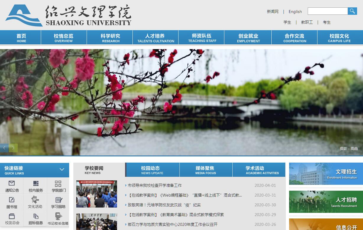 紹興文理學(xué)院是教育部批準(zhǔn)的普通全日制綜合性高等學(xué)校。學(xué)校的辦學(xué)歷史可追溯到1909年創(chuàng)辦的山會初級師范學(xué)堂,魯迅先生曾出任山會師范學(xué)堂監(jiān)督(校長)。1996年紹興師范??茖W(xué)校與紹興高等??茖W(xué)校等合并建立紹興文理學(xué)院。2000年紹興衛(wèi)生學(xué)校、上虞師范學(xué)校、紹興市城鄉(xiāng)建設(shè)職工中等專業(yè)學(xué)校相繼并入。2005年學(xué)校以良好成績通過教育部本科教學(xué)工作水平評估。2013年被國務(wù)院學(xué)位委員會批準(zhǔn)為碩士學(xué)位授予單位。學(xué)校坐落于全國首批歷史文化名城紹興。擁有風(fēng)則江(河?xùn)|、河西區(qū)塊)、南山、蘭亭、上虞等4個校區(qū),校園占地面積1488.97畝,另有水域使用面積36.78畝,校舍總建筑面積63.82萬平方米,教學(xué)科研儀器設(shè)備總值3.3億元,館藏紙質(zhì)圖書183.49萬冊,電子圖書約113萬冊,各類中外文電子期刊101.99萬冊,資料數(shù)據(jù)庫47個。設(shè)有人文學(xué)院、馬克思主義學(xué)院、外國語學(xué)院、數(shù)理信息學(xué)院、生命科學(xué)學(xué)院、化學(xué)化工學(xué)院、機(jī)械與電氣工程學(xué)院、土木工程學(xué)院、紡織服裝學(xué)院、商學(xué)院、醫(yī)學(xué)院、藝術(shù)學(xué)院、蘭亭書法藝術(shù)學(xué)院、教師教育學(xué)院、上虞分院、繼續(xù)教育學(xué)院等15個二級學(xué)院和紹興文理學(xué)院附屬醫(yī)院,另有1個獨(dú)立學(xué)院(紹興文理學(xué)院元培學(xué)院)?,F(xiàn)有各類全日制在校學(xué)生1.5萬余人。學(xué)校堅持立德樹人根本任務(wù),牢固確立人才培養(yǎng)的根本使命,大力推進(jìn)應(yīng)用型人才培養(yǎng)體系改革與實(shí)踐,著力增強(qiáng)學(xué)生的社會責(zé)任感、創(chuàng)新精神和實(shí)踐能力。學(xué)?,F(xiàn)有61個本科專業(yè),涵蓋經(jīng)濟(jì)學(xué)、法學(xué)、教育學(xué)、文學(xué)、理學(xué)、工學(xué)、醫(yī)學(xué)、管理學(xué)、藝術(shù)學(xué)等九大學(xué)科門類。學(xué)校擁有漢語言文學(xué)、生物科學(xué)、紡織工程等3個國家級特色專業(yè),生物科學(xué)、漢語言文學(xué)、工商管理、會計學(xué)、小學(xué)教育、紡織工程、數(shù)學(xué)與應(yīng)用數(shù)學(xué)、化學(xué)、護(hù)理學(xué)、機(jī)械設(shè)計制造及其自動化等10個省級重點(diǎn)(建設(shè))專業(yè),漢語言文學(xué)、紡織工程等2個省“十二五”優(yōu)勢專業(yè),書法學(xué)、自動化、土木工程、輕化工程、國際經(jīng)濟(jì)與貿(mào)易、微電子科學(xué)與工程、釀酒工程、服裝設(shè)計與工程、機(jī)械設(shè)計制造及其自動化、計算機(jī)科學(xué)與技術(shù)等10個省“十二五”新興特色專業(yè)建設(shè)項(xiàng)目,漢語言文學(xué)1個省“十三五”優(yōu)勢專業(yè)建設(shè)項(xiàng)目,紡織工程、自動化、書法學(xué)等3個省“十三五”特色專業(yè)建設(shè)項(xiàng)目,生物、電工電子、物理、化學(xué)、經(jīng)濟(jì)與管理、電子科學(xué)與信息、機(jī)械工程、醫(yī)學(xué)等8個省級實(shí)驗(yàn)教學(xué)示范中心,電工電子1個省級實(shí)驗(yàn)教學(xué)示范中心重點(diǎn)建設(shè)項(xiàng)目,1個省級人才培養(yǎng)模式創(chuàng)新實(shí)驗(yàn)區(qū),1個省級大學(xué)生校外實(shí)踐教育基地,24門省級精品課程。2005年以來,獲國家級教學(xué)成果二等獎2項(xiàng)(其中1項(xiàng)為第二完成單位)、省級教學(xué)成果一等獎6項(xiàng)(其中2項(xiàng)為第二完成單位)、二等獎4項(xiàng)。學(xué)校面向全國26個省市區(qū)招生,是浙江省第一批本科招生院校。學(xué)校是“全國大學(xué)英語教學(xué)改革第二批示范點(diǎn)項(xiàng)目學(xué)?!薄罢憬?yīng)用型建設(shè)試點(diǎn)院?!薄罢憬〗處熃逃亍薄罢憬 濉攸c(diǎn)建設(shè)教師培養(yǎng)基地”“浙江省首批高校文化校園建設(shè)試點(diǎn)單位”,蘭亭書法藝術(shù)學(xué)院是浙江省首家高校外國留學(xué)生書法教育基地和浙江省書法家協(xié)會書法創(chuàng)作基地,大學(xué)生創(chuàng)業(yè)園是首批“浙江省大學(xué)生創(chuàng)業(yè)示范基地”。“風(fēng)則江大講堂”、畢業(yè)生“愛心承諾”、“卓越獎學(xué)金”評選是全國高校優(yōu)秀校園文化品牌,書院制改革和文明寢室建設(shè)兩次獲全國高校學(xué)生公寓工作優(yōu)秀成果一等獎。大學(xué)生學(xué)科競賽多次獲得全國一等獎殊榮,總成績排名位列同類院校前列。畢業(yè)生深受用人單位歡迎,畢業(yè)生初次就業(yè)率保持在95%以上,畢業(yè)生對學(xué)??傮w滿意度高,位列全省高校前列。學(xué)校堅持以學(xué)科建設(shè)為核心、科學(xué)研究為支撐,積極推進(jìn)協(xié)同創(chuàng)新,全面提升科研水平與社會服務(wù)能力。目前擁有中國語言文學(xué)、工商管理、化學(xué)、數(shù)學(xué)、物理學(xué)、生物學(xué)、紡織科學(xué)與工程等7個碩士學(xué)位授權(quán)一級學(xué)科和建筑與土木工程、教育、漢語國際教育、臨床醫(yī)學(xué)、會計、藝術(shù)等6個專業(yè)碩士學(xué)位點(diǎn),中國語言文學(xué)、物理學(xué)、教育學(xué)、化學(xué)、土木工程、紡織科學(xué)與工程等6個省一流學(xué)科(B