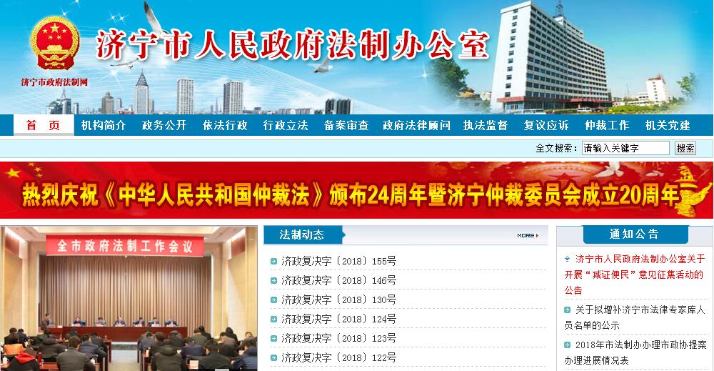 濟(jì)寧市政府法制辦公室(掛濟(jì)寧市行政執(zhí)法監(jiān)督局牌子)是主管全市政府法制建設(shè)的市政府工作部門。主要職責(zé)是:(一)調(diào)查研究依法行政和政府法制建設(shè)中出現(xiàn)的新情況、新問題,提出推進(jìn)依法行政的具體措施和工作建議;承擔(dān)市政府推進(jìn)依法行政日常工作;負(fù)責(zé)全市依法行政的綜合協(xié)調(diào)、督促檢查和政策研究。(二)承擔(dān)市政府重大決策、合同的合法性論證審查工作。(三)負(fù)責(zé)統(tǒng)籌規(guī)劃市政府規(guī)范性文件制定工作,擬訂市政府年度規(guī)范性文件制定計劃,報經(jīng)市政府批準(zhǔn)后組織實施。(四)承擔(dān)審查報送市政府的規(guī)范性文件草案的責(zé)任;負(fù)責(zé)起草或組織起草重要的規(guī)范性文件草案;負(fù)責(zé)市政府規(guī)范性文件草案向社會公開征求意見,負(fù)責(zé)法律草案、法規(guī)草案、規(guī)章草案征求意見的辦理工作。(五)承辦市政府規(guī)范性文件的解釋工作;負(fù)責(zé)規(guī)范性文件實施情況的評估工作;負(fù)責(zé)清理、編纂規(guī)范性文件,對規(guī)范性文件提出清理或者修改意見。(六)負(fù)責(zé)市政府各部門、各縣(市、區(qū))人民政府制定的規(guī)范性文件的備案審查工作,審查其同憲法、法律、行政法規(guī)、地方性法規(guī)、省政府規(guī)章、市政府規(guī)范性文件是否抵觸以及它們相互之間是否矛盾,根據(jù)不同情況提出處理建議。(七)研究行政訴訟、行政復(fù)議、行政賠償、行政處罰、行政許可、行政收費、行政執(zhí)行等法律法規(guī)規(guī)章實施以及行政執(zhí)法中帶有普遍性的問題,向市政府提出完善制度和解決問題的建議。(八)負(fù)責(zé)組織全市行政執(zhí)法人員的法律知識培訓(xùn)、考試;負(fù)責(zé)行政執(zhí)法資格審查;辦理行政執(zhí)法人員資格證書;承辦行政處罰聽證主持人、行政復(fù)議應(yīng)訴人員的資格審查和培訓(xùn)考試工作。(九)負(fù)責(zé)對市政府機(jī)關(guān)及縣(市、區(qū))人民政府的行政執(zhí)法行為進(jìn)行監(jiān)督檢查;協(xié)調(diào)部門之間在法律法規(guī)規(guī)章實施中的矛盾和爭議;參與推進(jìn)行政審批制度改革工作,依法對行政許可(審批)事項進(jìn)行清理審查,監(jiān)督檢查各行政許可機(jī)關(guān)的行政許可行為;承擔(dān)推進(jìn)相對集中行政許可權(quán)工作,負(fù)責(zé)并指導(dǎo)有關(guān)部門推進(jìn)相對集中行政處罰權(quán)工作;審查須經(jīng)市政府批準(zhǔn)或作出的行政處罰決定。(十)負(fù)責(zé)推行行政執(zhí)法責(zé)任制;負(fù)責(zé)組織協(xié)調(diào)和執(zhí)法責(zé)任制的評議考核工作;承辦行政執(zhí)法錯案責(zé)任追究事項。(十一)承擔(dān)市政府行政復(fù)議事項,指導(dǎo)、監(jiān)督全市的行政復(fù)議應(yīng)訴工作;受市政府委托代理行政應(yīng)訴和其他訴訟案件;負(fù)責(zé)有關(guān)市級行政賠償?shù)膮f(xié)調(diào)工作;參與本地區(qū)重大涉法案件的處理工作。(十二)負(fù)責(zé)依法行政和政府法制的信息公開、宣傳和新聞發(fā)布工作;承擔(dān)市政府法制咨詢委員會的日常工作;承擔(dān)市政府領(lǐng)導(dǎo)集體學(xué)法講座的具體工作;開展對外法制工作情況交流;為市政府領(lǐng)導(dǎo)和各部門提供法律咨詢服務(wù)和法制信息服務(wù)。(十三)指導(dǎo)、協(xié)調(diào)仲裁工作。(十四)承辦市委、市政府交辦的其他事項。