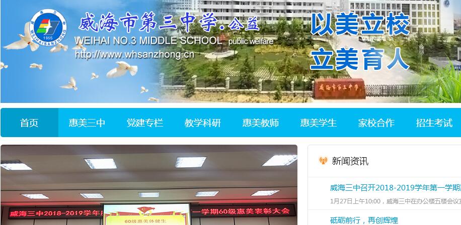 威海市第三中學(xué)位于經(jīng)濟(jì)技術(shù)開發(fā)區(qū)橋頭鎮(zhèn)駐地,始建于1955年,現(xiàn)占地110畝,是威海市教育局直屬的普通高中,2001年成功創(chuàng)建山東省規(guī)范化學(xué)校?,F(xiàn)有30個(gè)教學(xué)班、教職工148人、在校生1450余人。學(xué)校先后獲得“山東省學(xué)校民主管理先進(jìn)單位”“山東省電教示范學(xué)校”“山東省中小學(xué)安全文化建設(shè)重點(diǎn)研究基地”“威海市文明單位”“乒乓球體育傳統(tǒng)學(xué)?!薄皥@林綠化先進(jìn)單位”“心理健康教育示范學(xué)?!薄巴J袃?yōu)秀交通安全示范學(xué)?!薄巴J惺称钒踩痉秾W(xué)?!钡葮s譽(yù)稱號(hào),并入選威海市第二批特色培養(yǎng)學(xué)校。學(xué)校自2003年上劃威海市級(jí)管理以來,在市委、市政府、市教育局的關(guān)懷下,全面實(shí)施現(xiàn)代化學(xué)校建設(shè)。高標(biāo)準(zhǔn)完成了基本設(shè)施建設(shè)和內(nèi)部配套工程,校園“教學(xué)區(qū)、辦公區(qū)、生活區(qū)、運(yùn)動(dòng)區(qū)”區(qū)劃分明,功能完善。教學(xué)區(qū)建有教學(xué)樓和實(shí)驗(yàn)樓各一座,實(shí)驗(yàn)樓先后建立健全了計(jì)算機(jī)、物理、化學(xué)、生物、音樂、美術(shù)、剪紙等功能室,教學(xué)樓建有配備多媒體設(shè)備及升降桌椅的教室30個(gè)以及年級(jí)管理室等;辦公區(qū)為一座五層綜合辦公樓,設(shè)有行政辦公區(qū)、各學(xué)科教研室、各職能部門辦公室、學(xué)科活動(dòng)教室、圖書館、校史館等;1萬7千多平米的運(yùn)動(dòng)區(qū),建有田徑場、籃球場、排球場、足球場、乒乓球場等;生活區(qū)包括兩座公寓樓、一座集體育館與餐廳于一體的多功能綜合樓。整體布局科學(xué),區(qū)劃合理,教學(xué)設(shè)施齊全,育人環(huán)境溫馨,為學(xué)生全面健康發(fā)展奠定了堅(jiān)實(shí)的物質(zhì)基礎(chǔ)。學(xué)校各屆領(lǐng)導(dǎo)班子率領(lǐng)全校教職工,勵(lì)精圖治,與時(shí)俱進(jìn)。2011年以來,在時(shí)任校長張良同志的帶領(lǐng)下,領(lǐng)導(dǎo)班子群策群力,定規(guī)劃,謀發(fā)展,追求教育的現(xiàn)代化、優(yōu)質(zhì)化,走出了一條“開拓創(chuàng)新、突破發(fā)展”的不平凡道路,實(shí)現(xiàn)了學(xué)校教育質(zhì)量的振興和辦學(xué)效果的提升。為推動(dòng)學(xué)校更高、更快發(fā)展,對學(xué)校歷史沿革、文化積淀、辦學(xué)實(shí)踐、教育優(yōu)勢等重新進(jìn)行審視和規(guī)劃,形成了“以美立校、立美育人”的惠美辦學(xué)理念,樹立了“打造培養(yǎng)體系多元化,惠美文化底蘊(yùn)深厚,辦學(xué)特色鮮明的現(xiàn)代化優(yōu)質(zhì)綜合高中”的辦學(xué)目標(biāo),形成了“以美輔德、以美啟智、以美健體”的校風(fēng)、“惠愛、賞美、育美、潤美”的教風(fēng)和“惠智、尚美、立美、創(chuàng)美”的學(xué)風(fēng),以“至真、至愛、至善、至美”為校訓(xùn),構(gòu)建了學(xué)校發(fā)展的核心價(jià)值體系,激活了學(xué)校發(fā)展的內(nèi)驅(qū)力,學(xué)校辦學(xué)特色日益鮮明,辦學(xué)質(zhì)量連年攀升,在社會(huì)上形成了一定的品牌效應(yīng)。2015年10月以來,新任校長王順海同志秉承傳承與創(chuàng)新的宗旨,明確以“綜合布局、多元發(fā)展、特色鮮明、優(yōu)質(zhì)提升”為近期發(fā)展目標(biāo),啟動(dòng)“惠美三中”建設(shè)的“一二三四五”工程?!耙弧笔侵复蛟煲浴盎菝馈睘楹诵牡牧钊嗣駶M意的教育。 依據(jù)生源實(shí)際,學(xué)校注重因材施教,各美其美,積極拓展多元化成才渠道,推動(dòng)“三個(gè)教育”持續(xù)發(fā)展。辦好合格教育,確保學(xué)業(yè)考試水平穩(wěn)中有升。實(shí)行多元化辦學(xué),突出特長教育,促使學(xué)生個(gè)性化特色發(fā)展。特別是藝術(shù)特長教育,近幾年高考藝術(shù)生雙過線人數(shù)都在百人以上,同時(shí)拓展春季高考班,實(shí)現(xiàn)了特長教育的規(guī)?;l(fā)展;同時(shí)增設(shè)日語教學(xué)課程,實(shí)現(xiàn)小語種教學(xué)的突破。著力優(yōu)質(zhì)教育,促進(jìn)高考成績穩(wěn)步提高?!岸笔侵附ㄔO(shè)惠美教師和惠美學(xué)生兩支隊(duì)伍。一方面建設(shè)專業(yè)與人文并重的惠美教師團(tuán)隊(duì)。以班主任隊(duì)伍建設(shè)為核心,全面提高教師業(yè)務(wù)水平和人文素養(yǎng);開展備課組主題文化建設(shè)活動(dòng),形成富有感召力的文化正能量。培養(yǎng)具有五維特質(zhì)的惠美學(xué)生群體。另一方面,堅(jiān)持“以愛育愛”和“精細(xì)化管理”,從惠美德育、惠美習(xí)慣、惠美安全、惠美創(chuàng)新和惠美社團(tuán)等五個(gè)維度,全面優(yōu)化管理體系,實(shí)現(xiàn)學(xué)生全面多元發(fā)展?!叭摹笔侵富趯W(xué)校生源教學(xué)實(shí)際,堅(jiān)持“降低難度不降低質(zhì)量”教學(xué)理念,創(chuàng)建并不斷優(yōu)化“三四四”惠美課堂模式?!叭h(huán)四步四維”教學(xué)流程:“三環(huán)”是教學(xué)準(zhǔn)備與實(shí)施的三個(gè)“教學(xué)環(huán)節(jié)”——基于標(biāo)準(zhǔn)的教學(xué)目標(biāo)設(shè)計(jì)、基于目標(biāo)的評(píng)價(jià)方案設(shè)計(jì)和基于目標(biāo)的教學(xué)流程設(shè)計(jì);“四步”指的是課堂